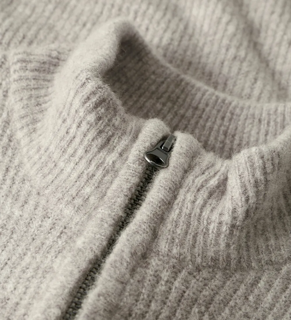Smart LMTD bluse meleret beige med ribstrikket struktur. Blusen har en mellemhøj krave med en kort lynlås fortil og lange ærmer.