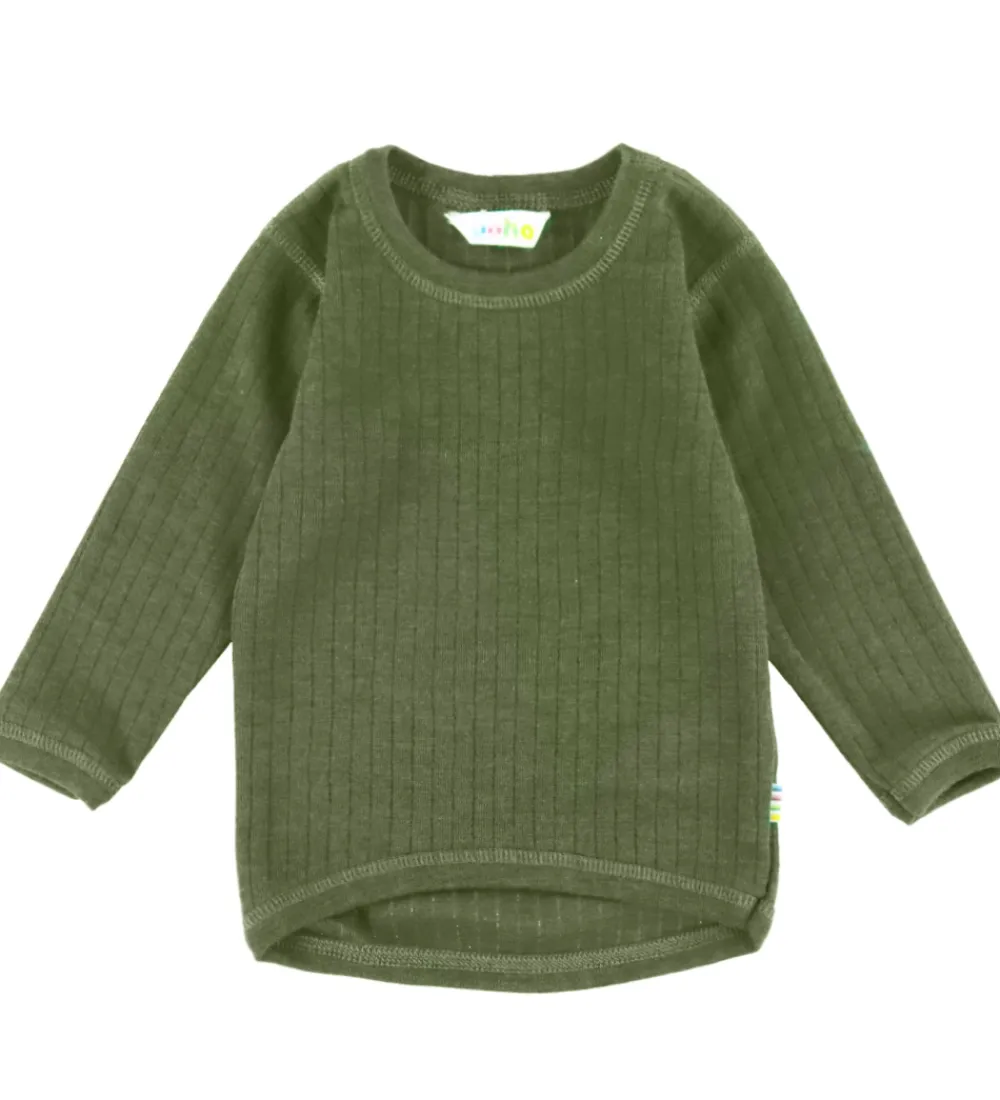 Praktisk Joha bluse i en dyb, olivengrøn farve med lange ærmer.