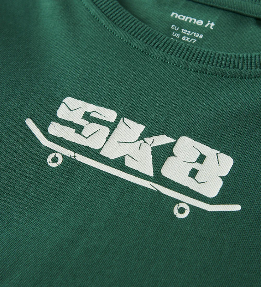 En bluse kommer i mørkegrøn med “SK8” og skateboard tryk på brystet, kombineret med lange hvide ærmer. Den anden bluse er dyb marineblå med et hvidt hockey-inspireret print samt lyseblå lange ærmer. Begge bluser har en rund halsudskæring.