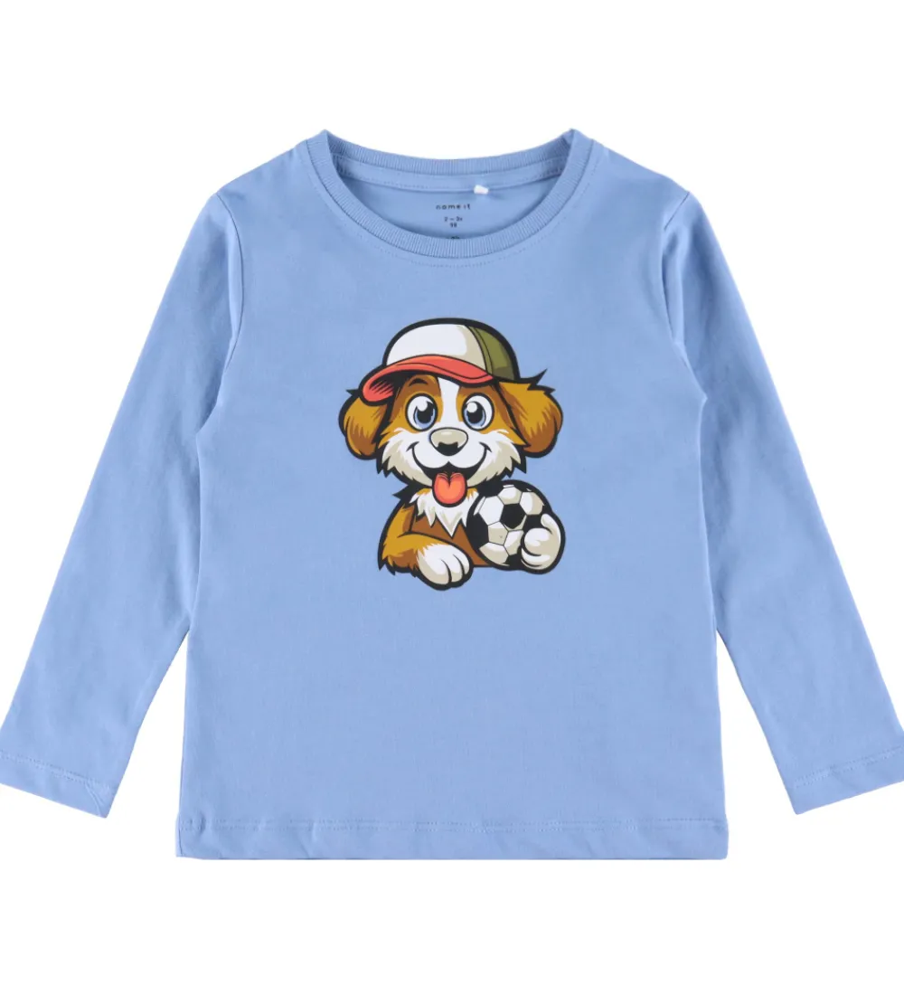 - Lyseblå med et print af en hund med kasket og fodbold foran