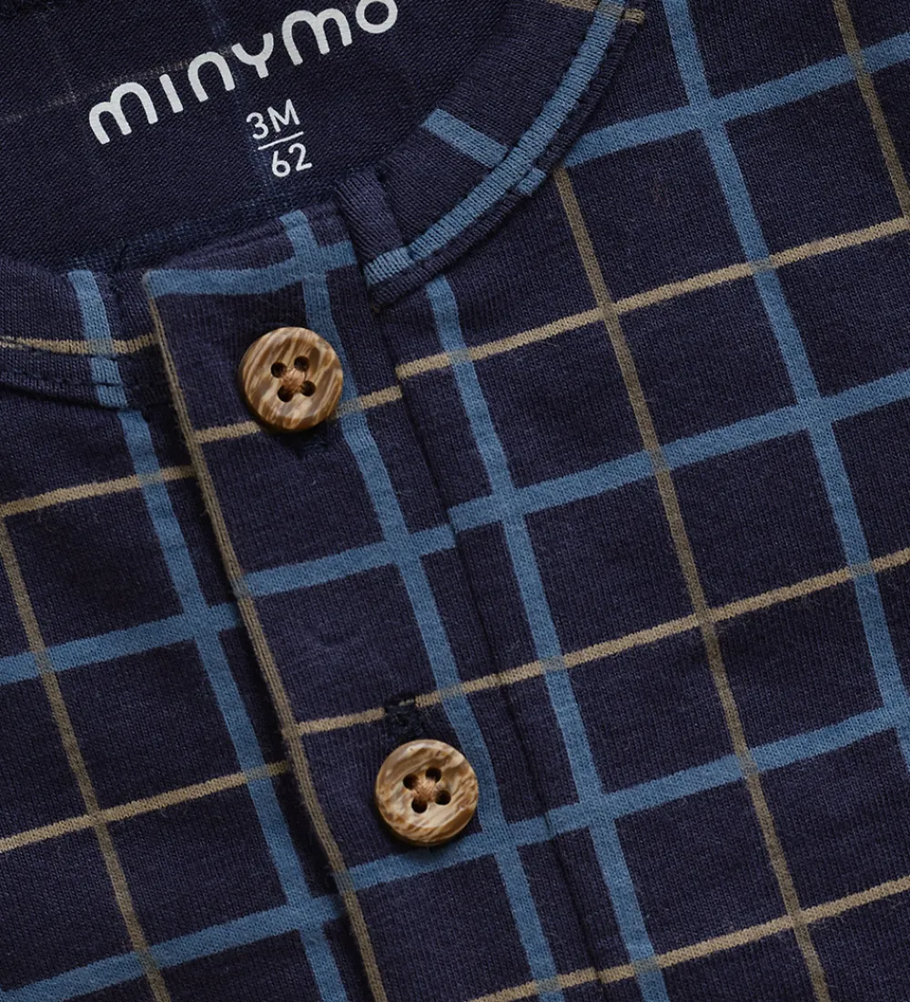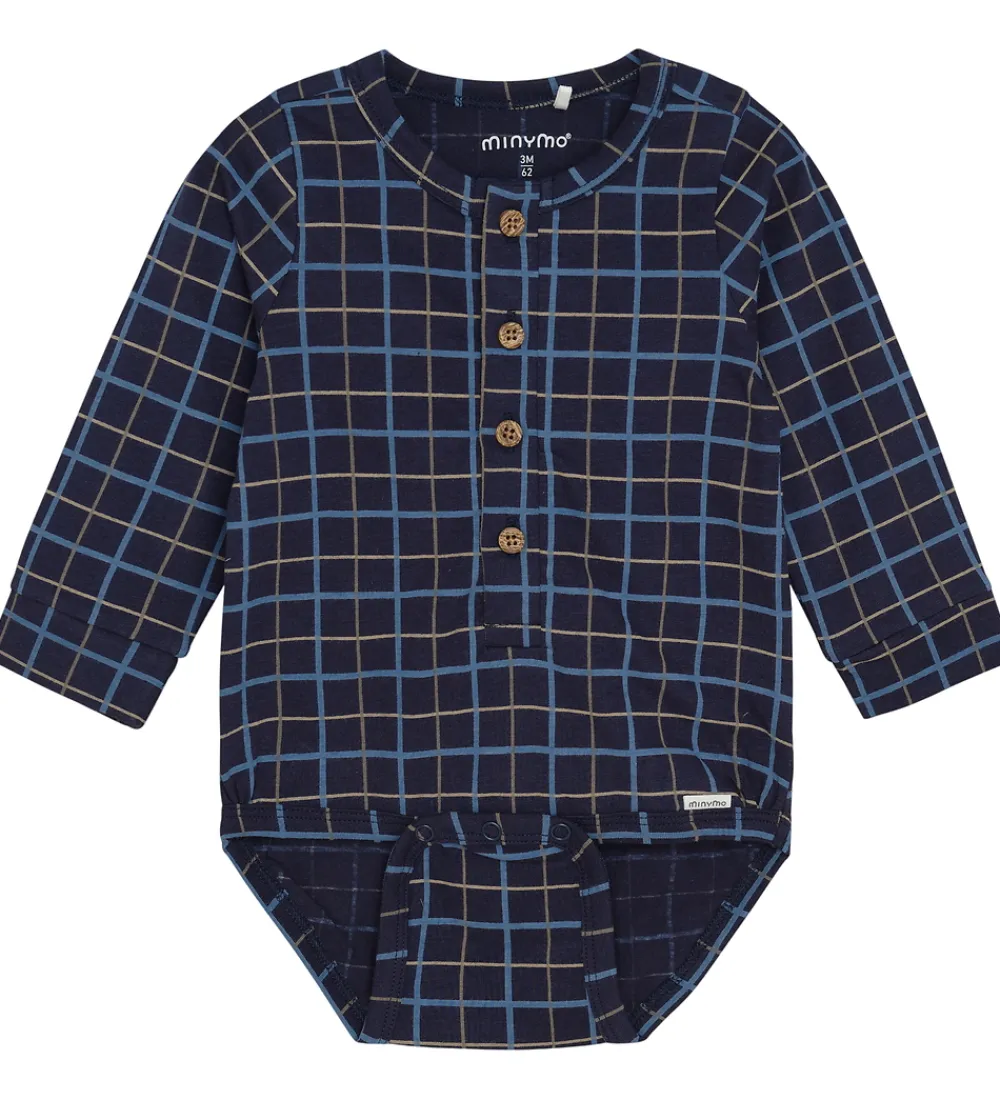 Elegant Minymo body i mørkeblå med ternet mønster i blå og brun. Bodyen har fine, brune knapper fortil og lange ærmer. Den lukkes mellem benene med trykknapper.