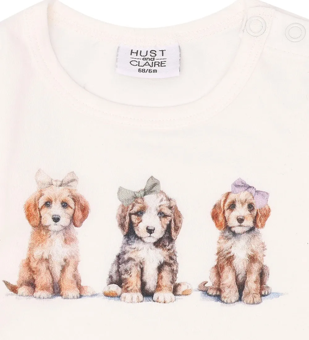 Charmerende Hust and Claire body med lange ærmer i en blød, cremehvid nuance. Bodyen er prydet med et sødt motiv af tre små hunde, hver iført en farverig sløjfe. Hust and Claire bodyen har en rund halsudskæring og fine rynkede detaljer ved ærmekanterne.