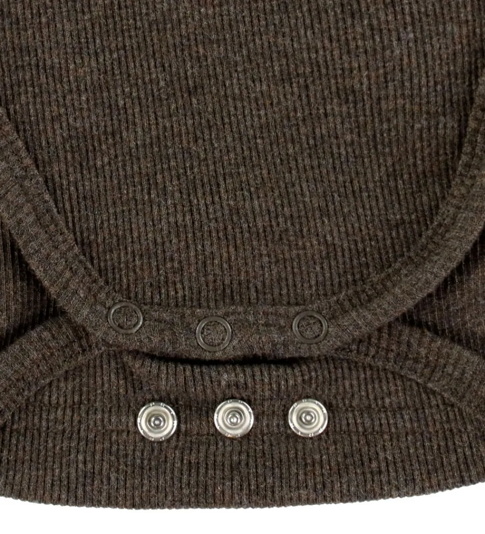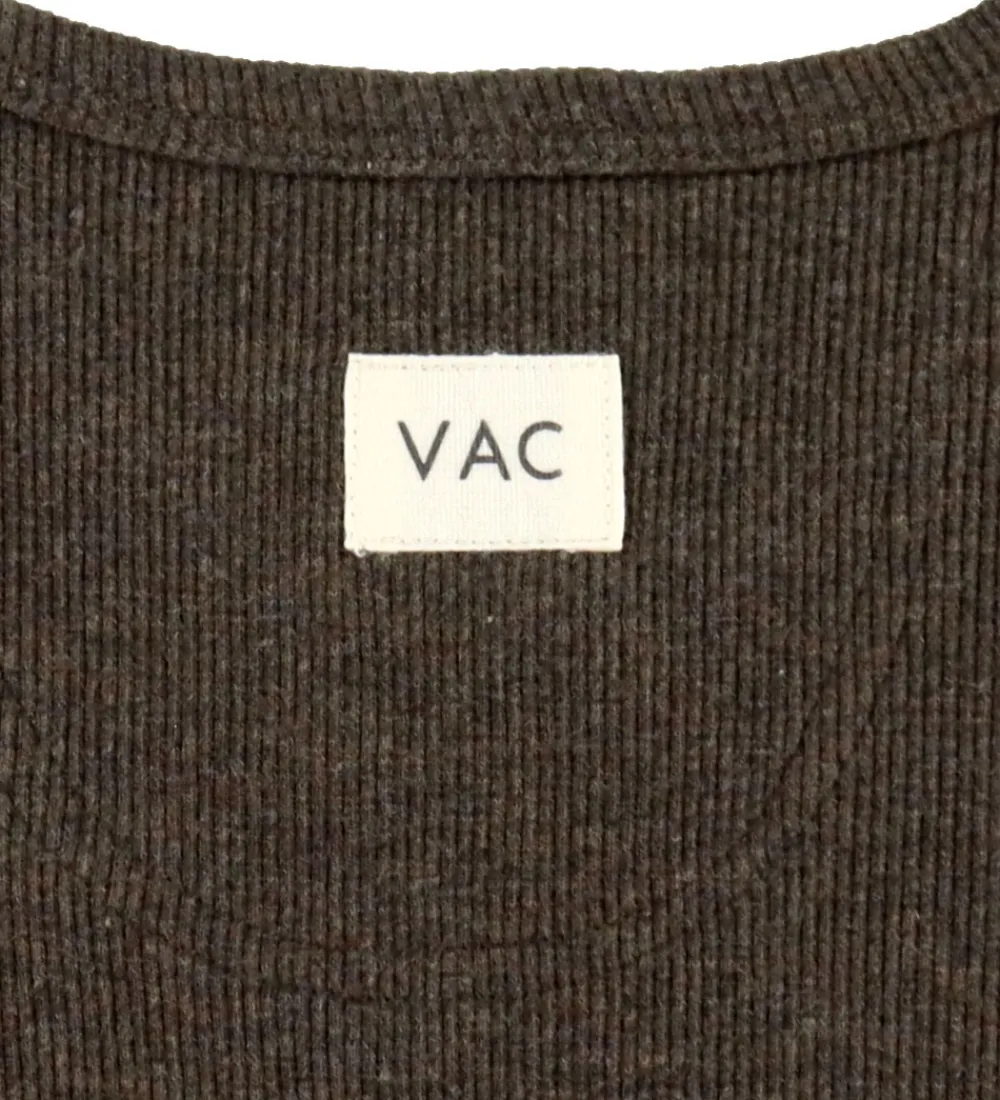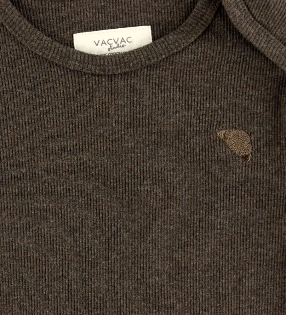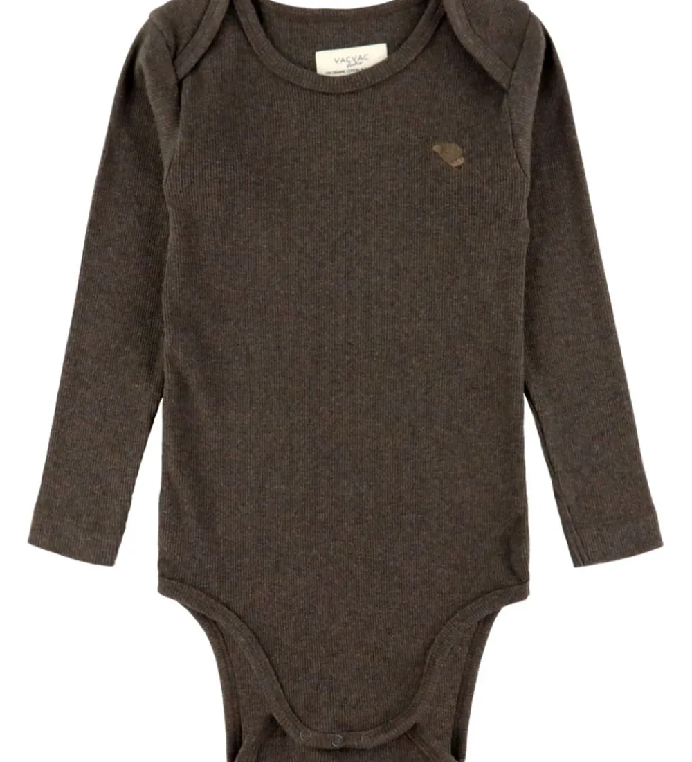 Elegant VACVAC body med lange ærmer i en dyb brun nuance med ribstruktur. VACVACs body har en lukning mellem benene med trykknapper, der sikrer nem påklædning og aftagning, og der er praktiske foldeskuldre.