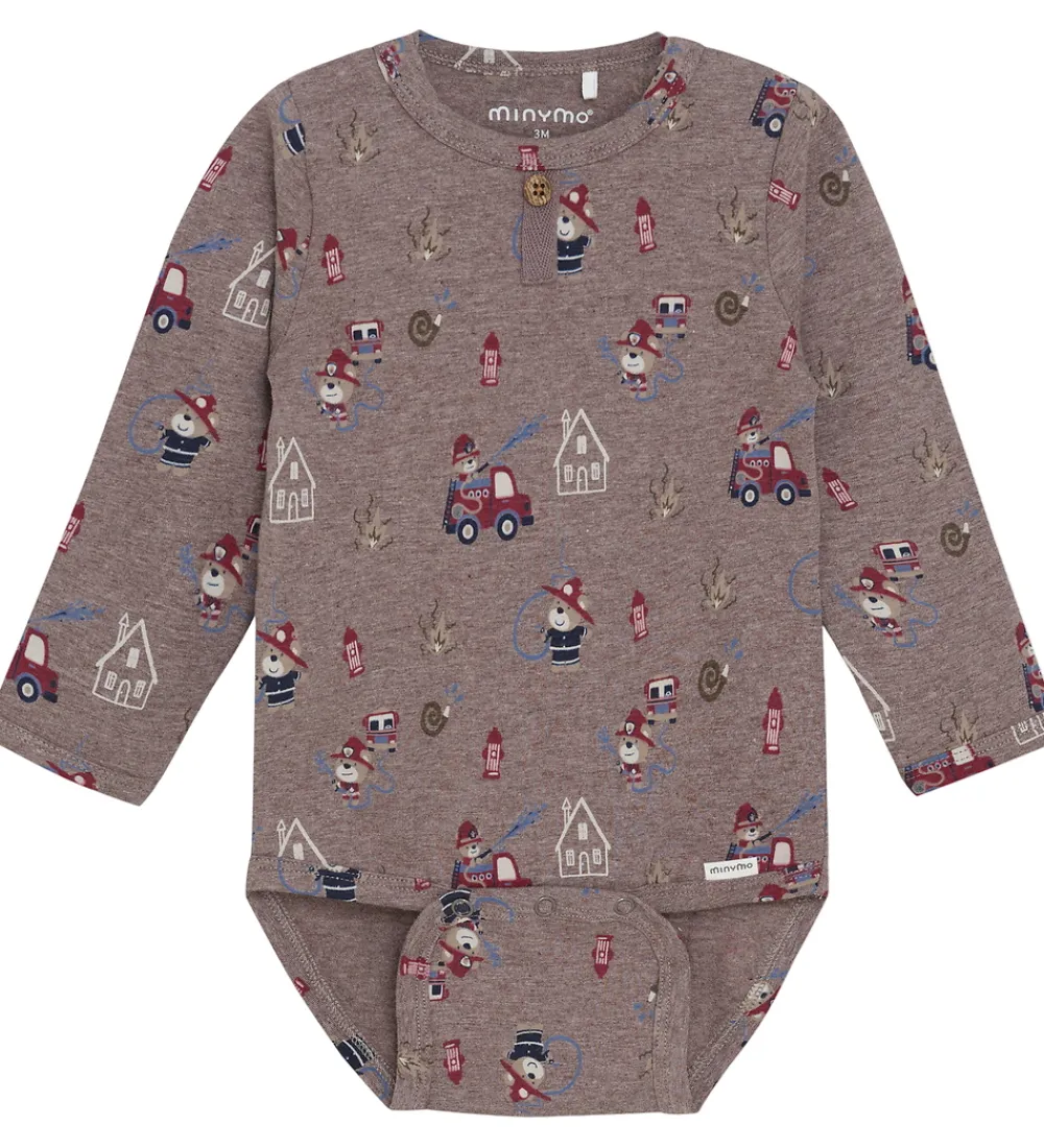 Charmerende Minymo body i meleret brun med brandmandstema. Bodyen har trykknapper ved skuldrene og lange ærmer. Den lukkes mellem benene med trykknapper.