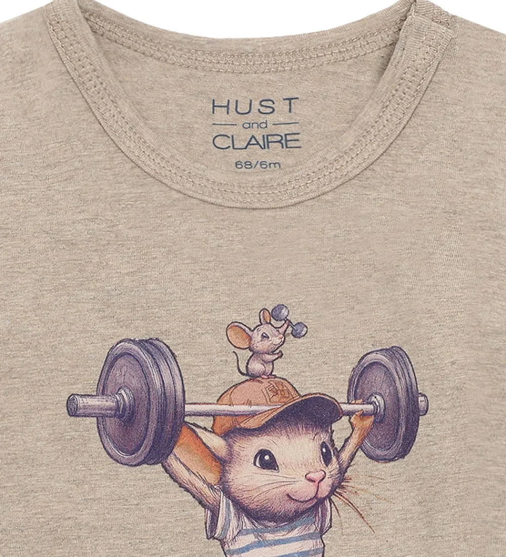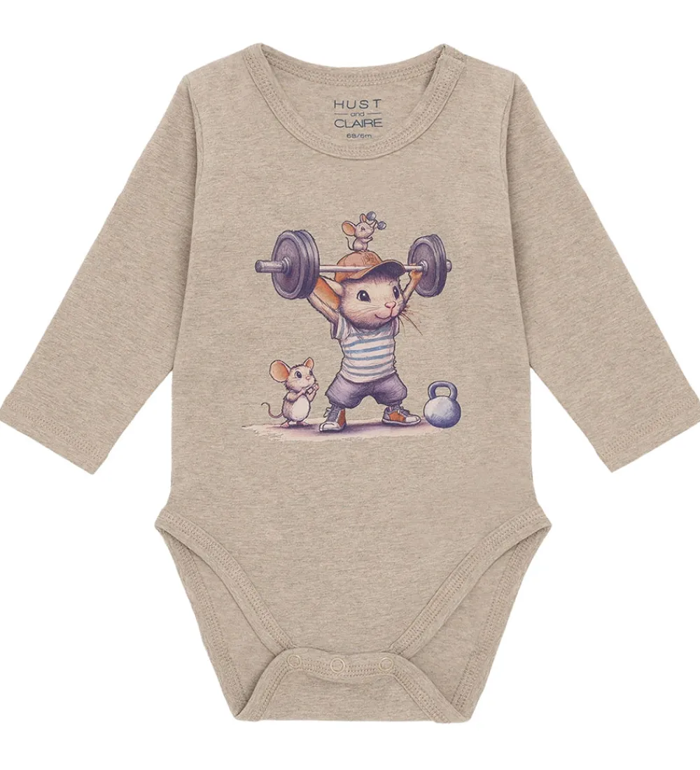 Chik Hust and Claire body i en klassisk beige nuance med lange ærmer. Bodyen har et charmerende print af en mus, der løfter vægte, hvilket tilfører et legende element. Halsudskæringen er rund, og der er trykknapper i bunden for nem lukning.