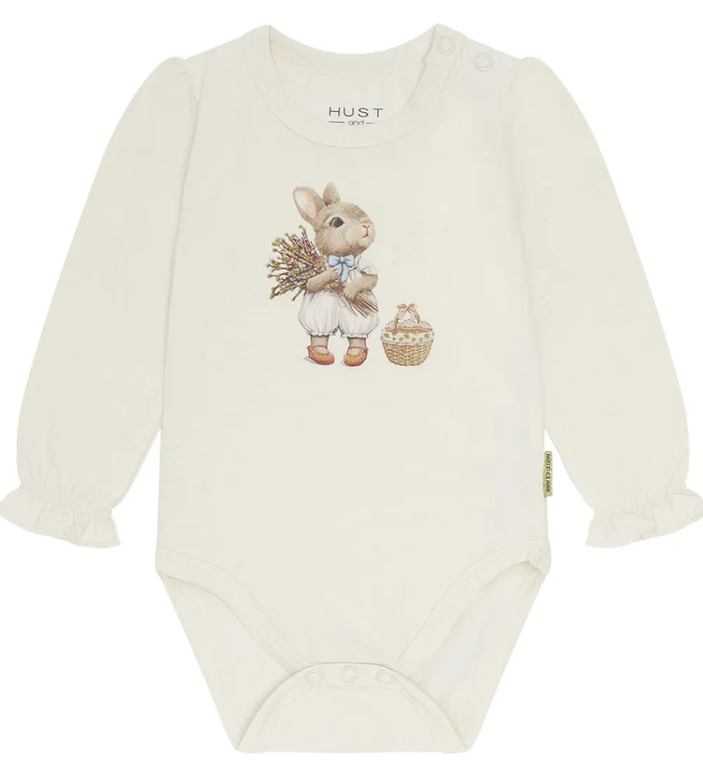 Fin Hust and Claire body med lange ærmer i en lys cremefarve. Bodyen prydes af et sødt print af en kanin med en buket korn ved siden af en kurv.