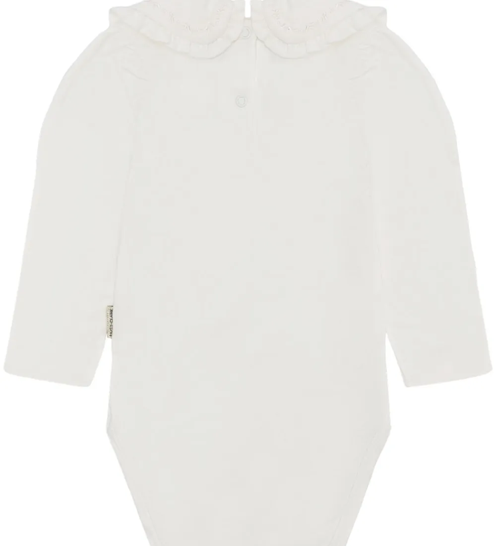 Elegant Hust and Claire body med lange ærmer i en ren hvid nuance. Bodyen har en smuk krave med fine flæsedetaljer, som giver et stilfuldt udtryk. Hust and Claire body er den perfekte tilføjelse til garderoben.