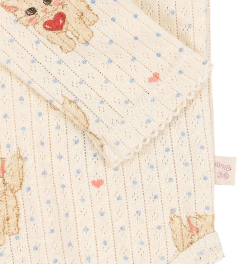 Charmerende Konges Sløjd body i beige med lange ærmer og et flot hulmønster. Bodyen prydes af et sødt print med små katte, der har farverige hjerter på brystet.