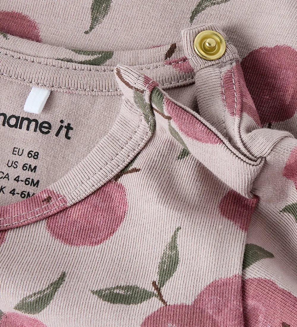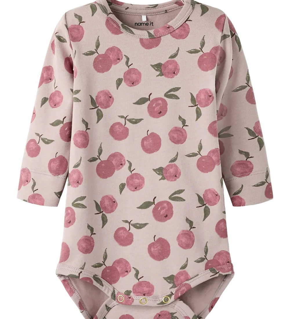 Fin Name It body i støvet lyselilla med et alloverprint af frugter i rosa og grønne nuancer. Bodyen har en rund halsudskæring med en trykknap ved venstre skulder og lange ærmer. Den lukkes mellem benene med trykknapper.