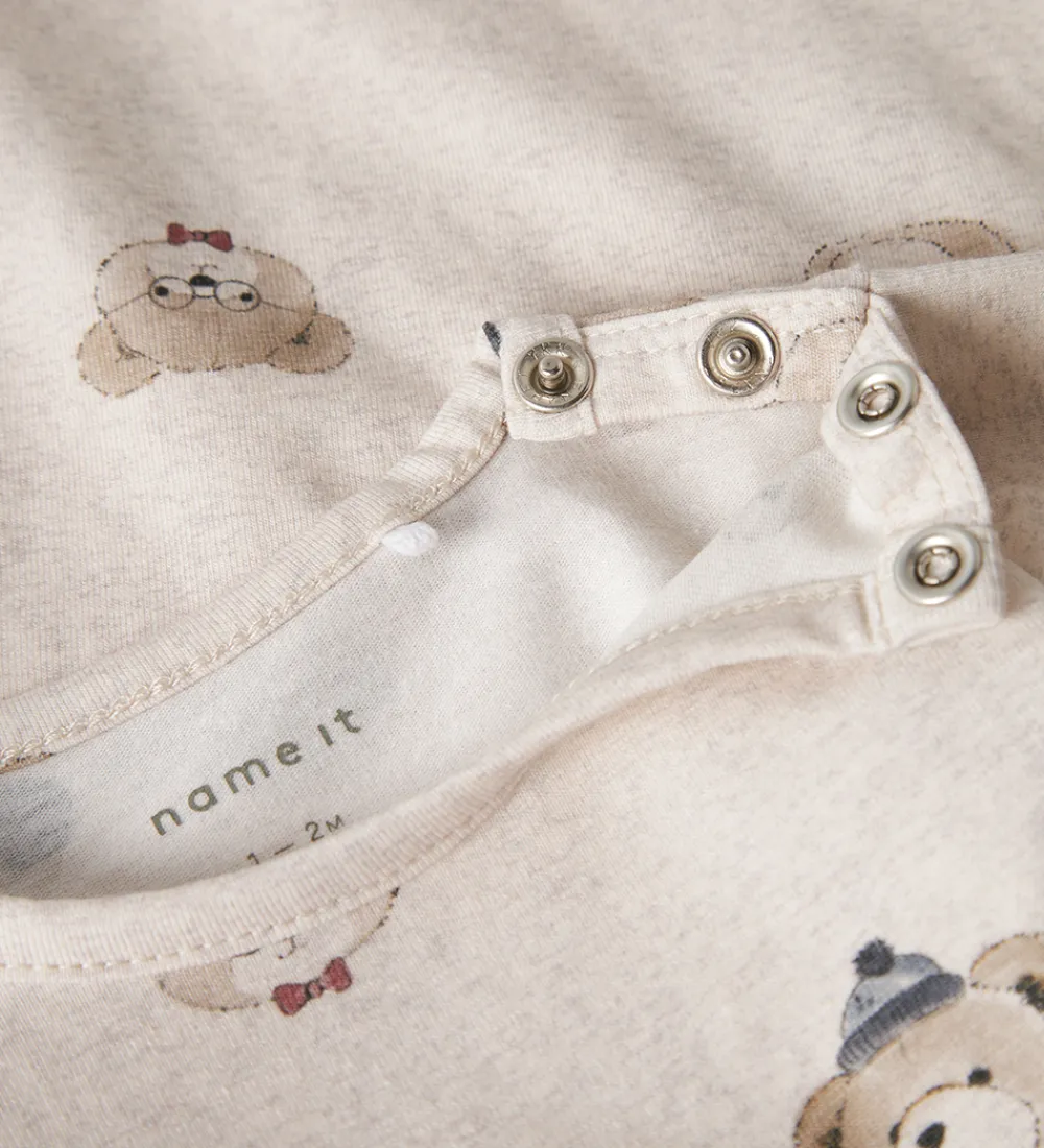 Fin Name It body i meleret beige med et alloverprint af søde bamser med briller og hatte. Bodyen har en rund halsudskæring med trykknapper ved venstre skulder og lange ærmer. Den lukkes mellem benene med trykknapper.