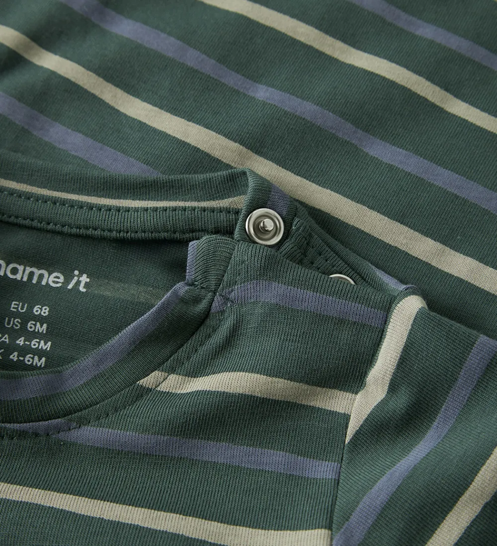 Charmerende Name It body i mørkegrøn med smalle striber i beige og blå nuancer. Bodyens design er enkel og tidløst, hvilket gør den til et alsidigt valg.