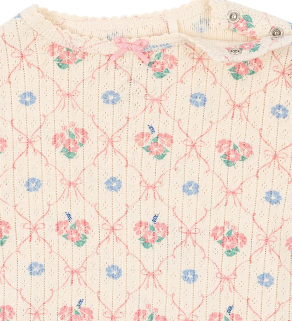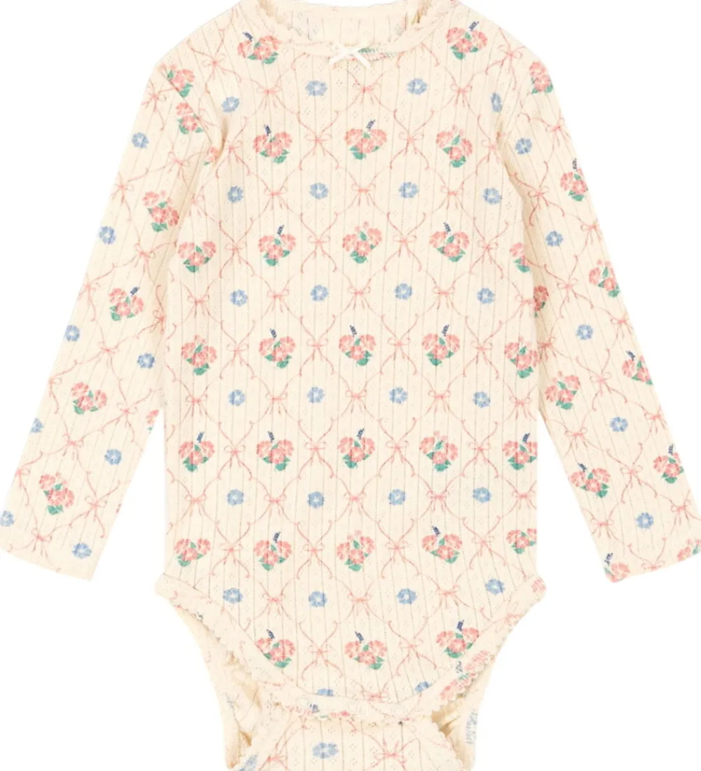 Lækker Konges Sløjd body i lysebeige med lange ærmer og et delikat blomstermønster i rosa, blå og grønne nuancer. Den ribbet struktur og det floote hulmønster giver et klassisk og charmerende udtryk.