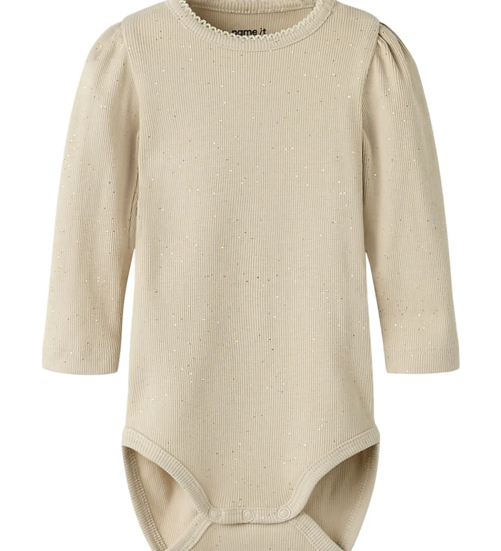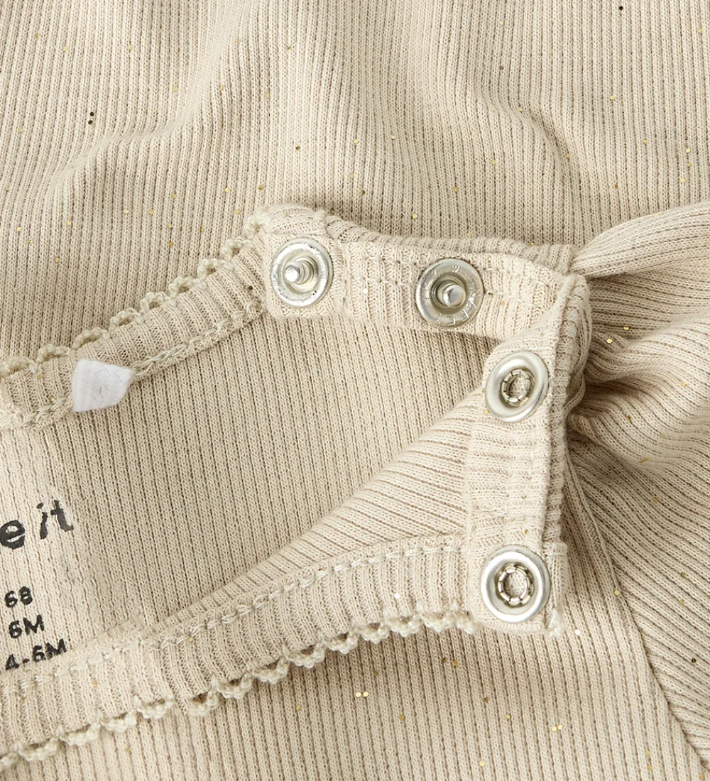 Elegant Name It body i en behagelig, lys beige nuance med en diskret glitterdetalje, der tilføjer et strejf af finesse. Bodyen har en ribbet struktur, der giver et klassisk udseende, mens de lange ærmer sikrer en god pasform. Den runde halsudskæring er simpel og stilren.