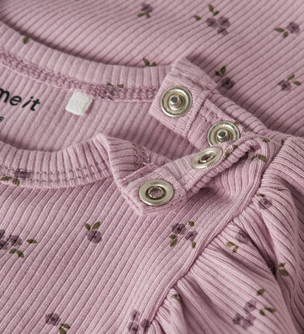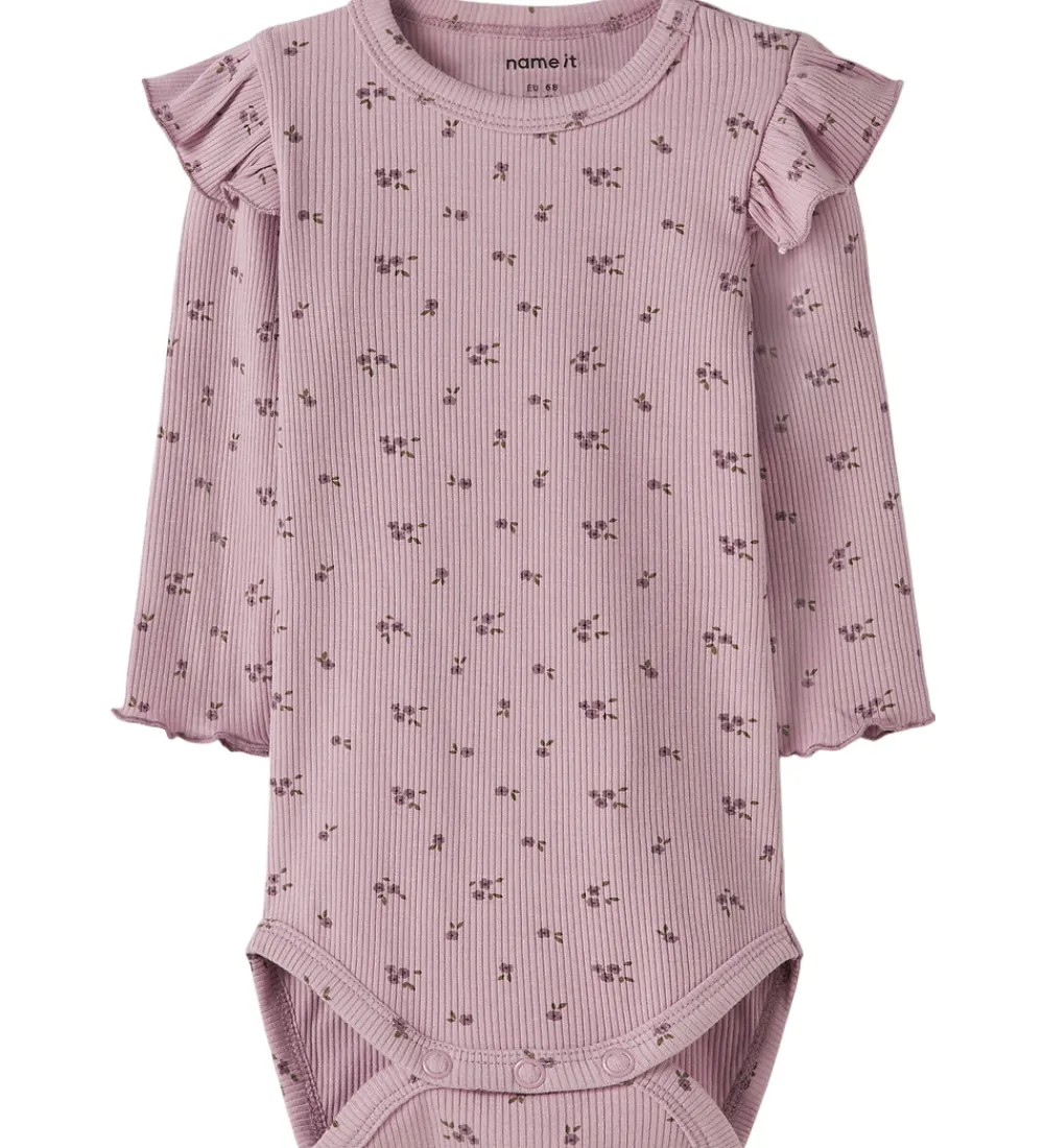 Bodyen har et fint mønster af små blomster og en delikat ribstruktur. Den har søde flæsedetaljer ved skuldrene, som giver et ekstra pift til designet. Name It bodyen har praktiske trykknapper i bunden og ved skulderen, hvilket sikrer en nem påklædning.