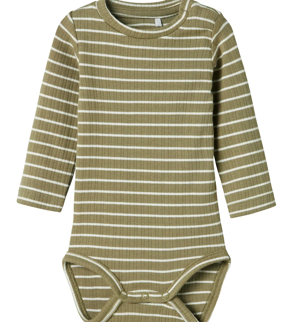 Flot Name It body i støvet grøn med hvide striber og fin ribstruktur. Bodyen har en rund halsudskæring og lange ærmer. Den lukkes med trykknapper ved venstre skulder og mellem benene.