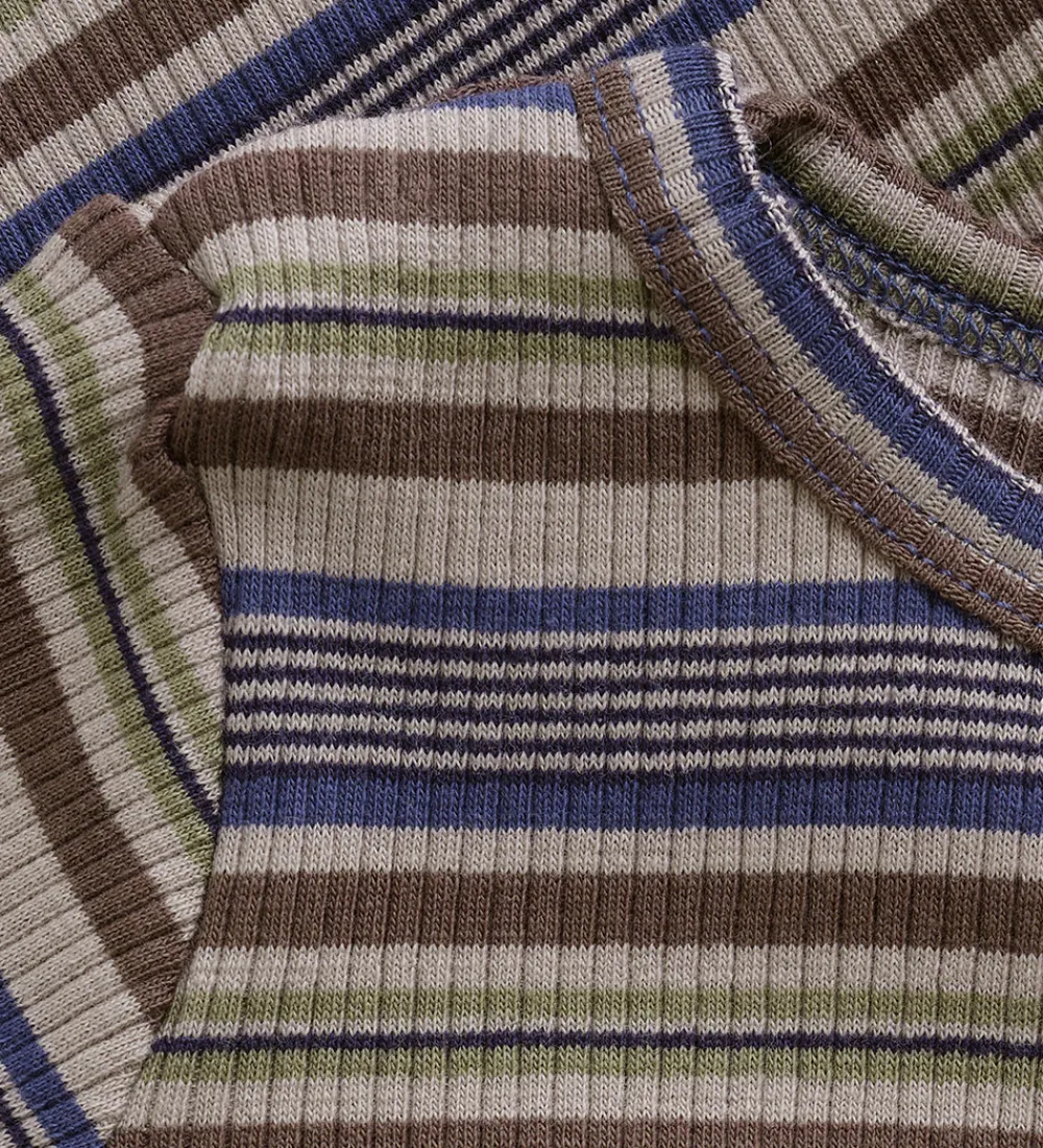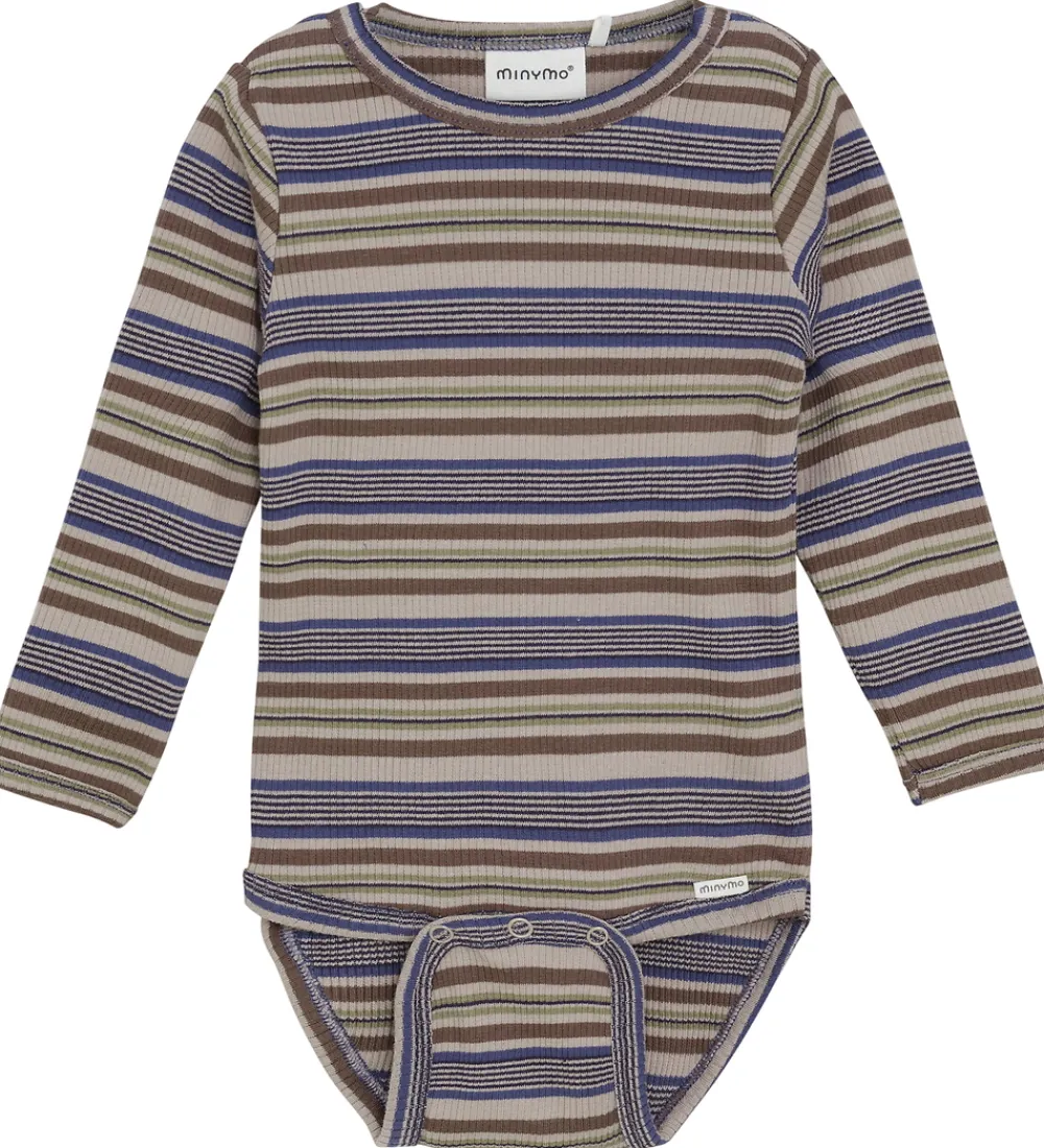 Skøn Minymo body i stribet beige, brun, blå, grøn og sort. Bodyen har ribstruktur og en rund halsudskæring med trykknapper ved skuldrene. Den har lange ærmer, og lukkes mellem benene med trykknapper.