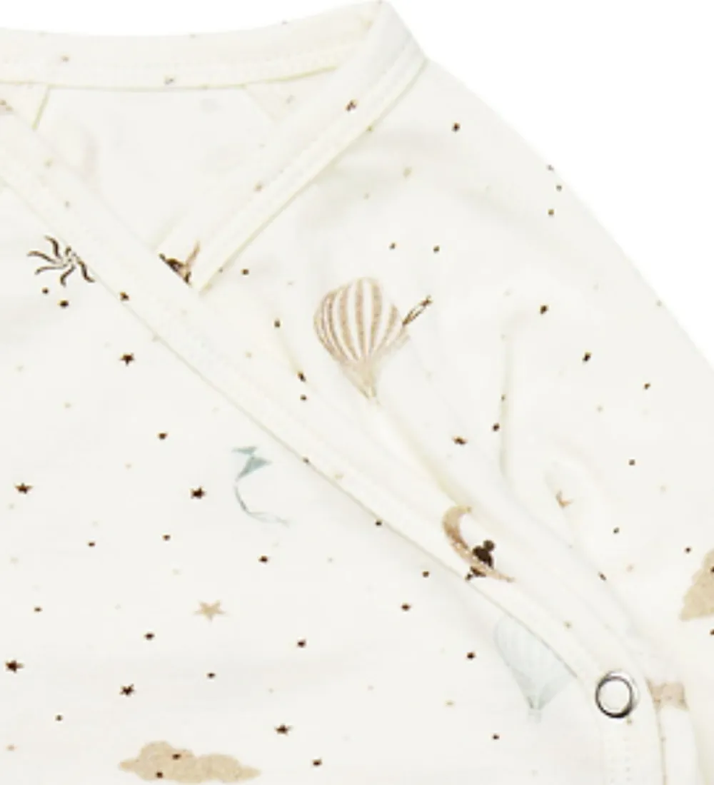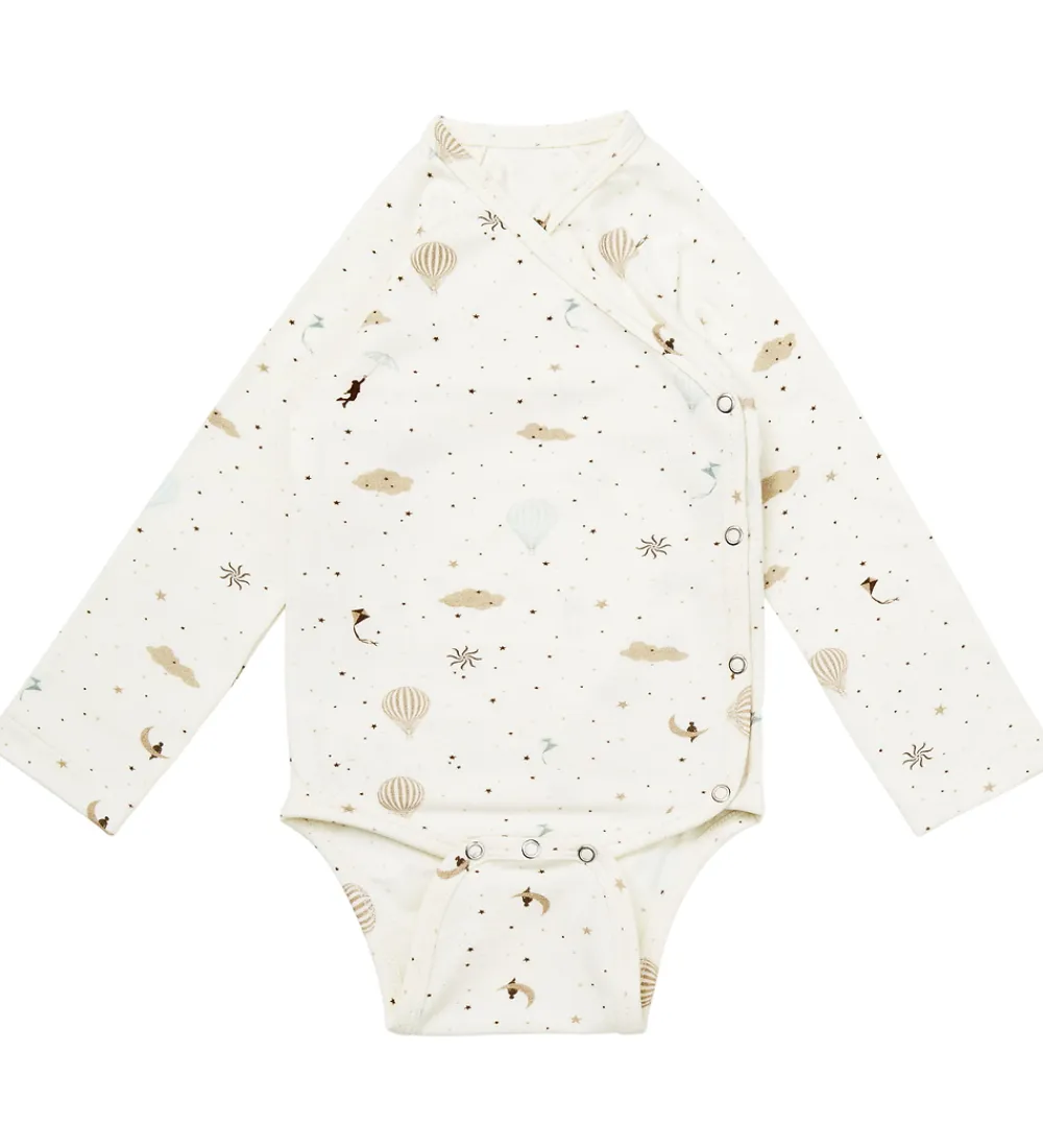 Skøn Cam Cam body i hvid med print af stjerner, skyer, drager og luftballoner i blå og brune nuancer. Bodyen har lange ærmer og et praktisk slå-om design med trykknapper langs siden samt mellem benene.
