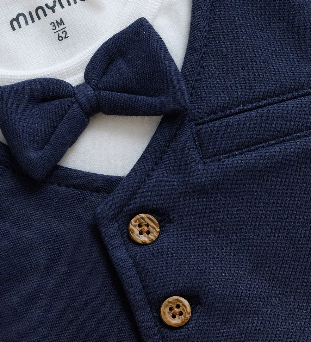 Elegant Minymo body i hvid med en påsyet vest og butterfly i navyblå. Minymo bodyen har en rund halsudskæring med tryknapper ved skuldrene og lange ærmer. Den lukkes mellem benene med trykknapper.