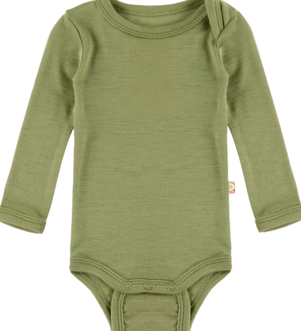 Flot Katvig body i en dæmpet grøn nuance. Den har en rund halsudskæring med foldeskulder i den ene side og lange ærmer. Bodyen lukkes mellem benene med trykknapper. Den er fremstillet af økologisk merinould.
