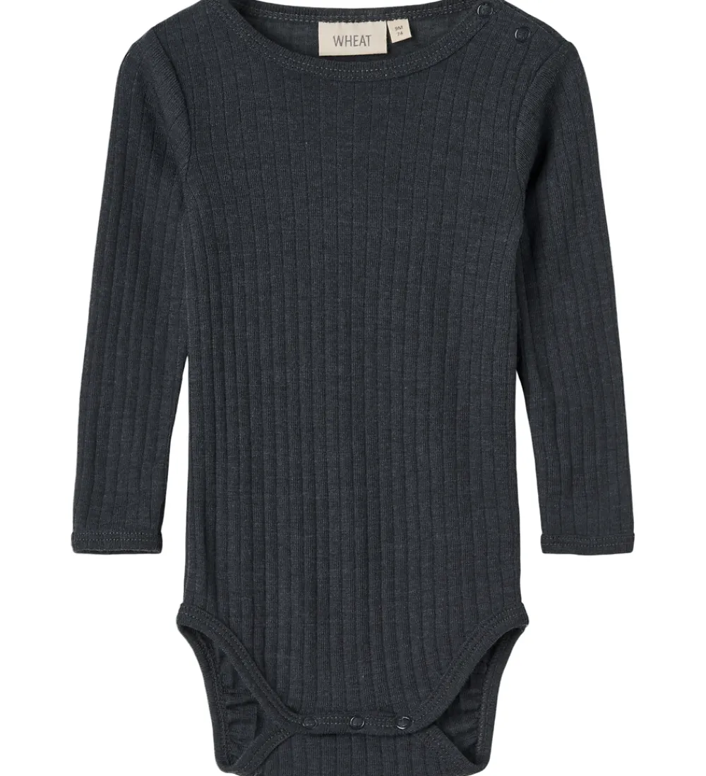 Stilren Wheat body i en dyb marineblå farve. Den har en klassisk ribstruktur, der understøtter dens tidløse design. Bodyen har lange ærmer og en rund halsudskæring med praktisk trykknaplukning ved skulderen.