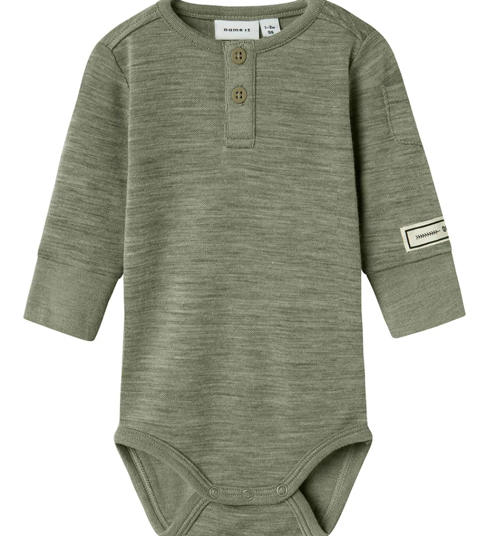Fin Name It body i gråmeleret med en lille, hvid applikation på venstre ærme. Bodyen har en rund halsudskæring med trykknapper foran, og lange ærmer med en lomme øverst på venstre ærme. Den har brede ribkanter ved håndleddene, og lukkes mellem benene med trykknapper. Bodyen er fremstillet i en blød blanding af merinould og viskose.