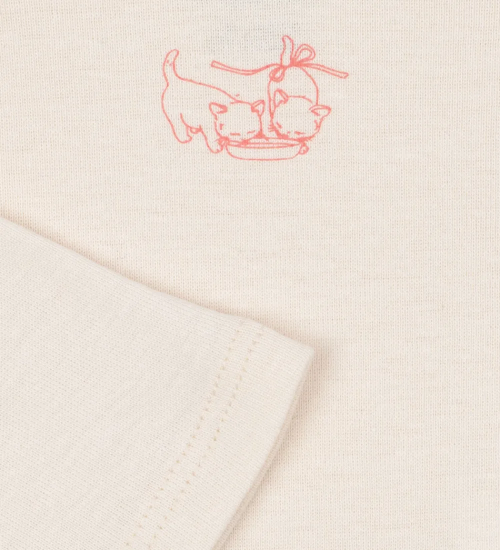 Bløde Fanga Fontana bodyer med lange ærmer solgt i en 3-pak. En af bodyerne er ensfarvet rosa med et lille katteprint, en anden har et delikat blomstermønster i forskellige, lyse farver, og den tredje er cremehvid med et diskret katteprint foran.