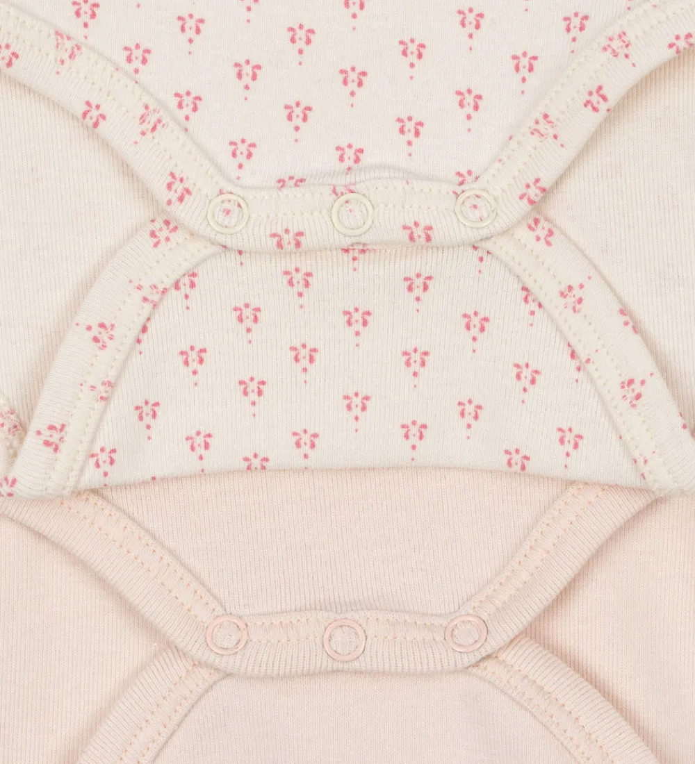 Fine bodyer fra Fanga Fontana med lange ærmer solgt i en 2-pak. Den ene body har et enkelt, ensfarvet design i lyserosa med et diskret katteprint ved brystet. Den anden body fra Fanga Fontana har et charmerende mønster med små, lyserøde motiver på en cremefarvet baggrund.