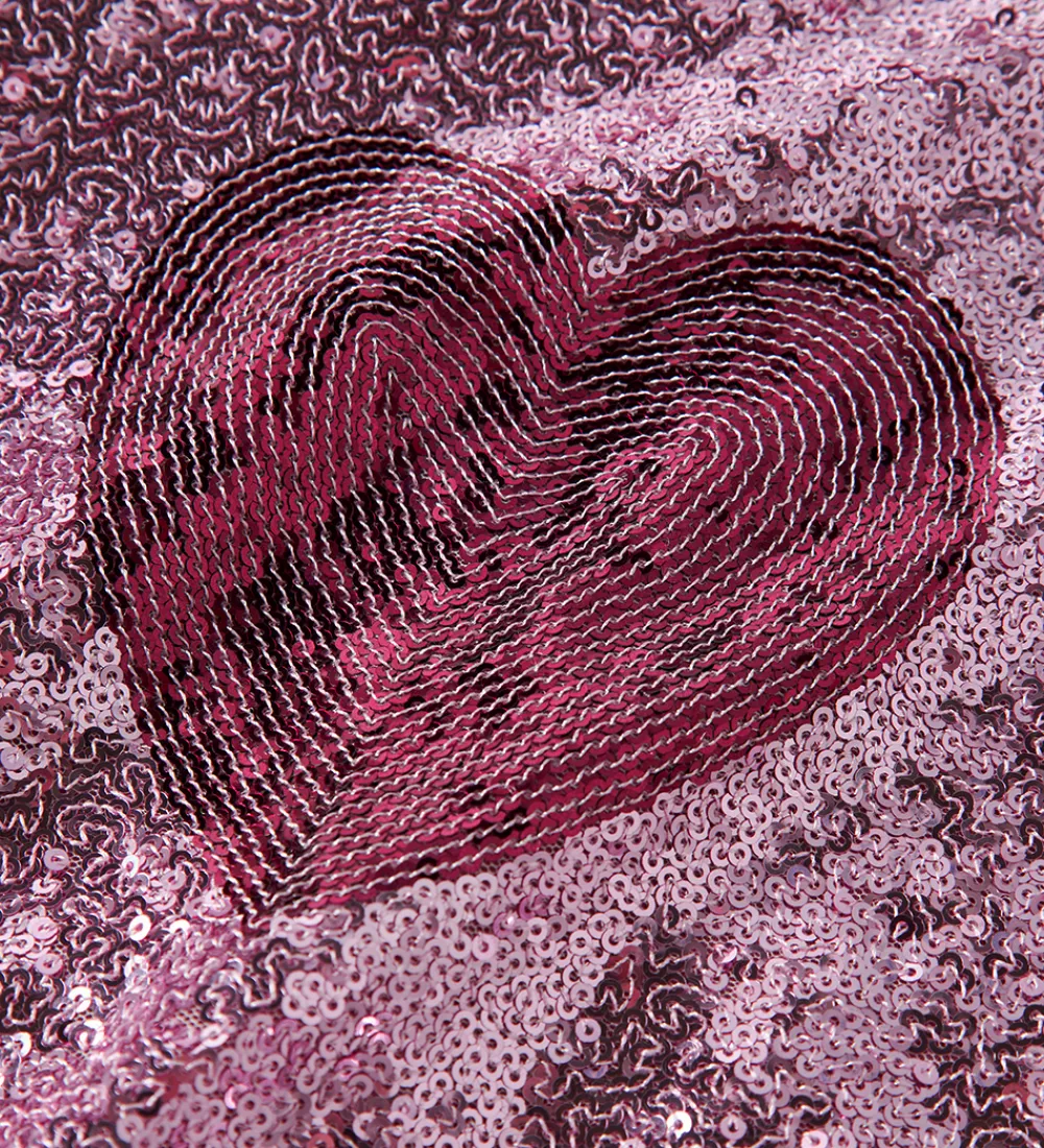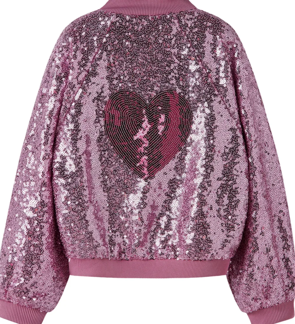 Festlig Name It bomberjakke i lilla med palietter. På ryggen er der palietter som danner et hjerte i midten i mørk rosa. Name It bomberjakken har en gennemgående lynlås fortil og lange ærmer. Ved hals-, ærme og taljeåbning er der ribkanter, som giver en god pasform.