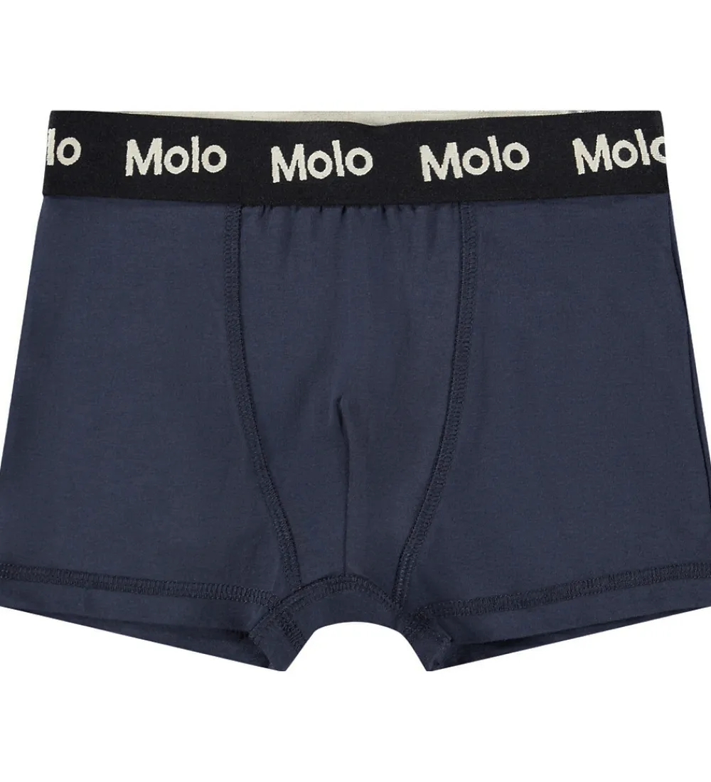 Praktiske Molo boxershorts i en pakke med to par. Det ene par er ensfarvet navy, mens det andet har et sjovt mønster med forskellige ansigter på navy baggrund. Molo boxershortsene har en elastikkant i livet, hvilket sikrer en behagelig pasform. Begge boxershorts er designet i et blødt materiale for maksimal komfort.