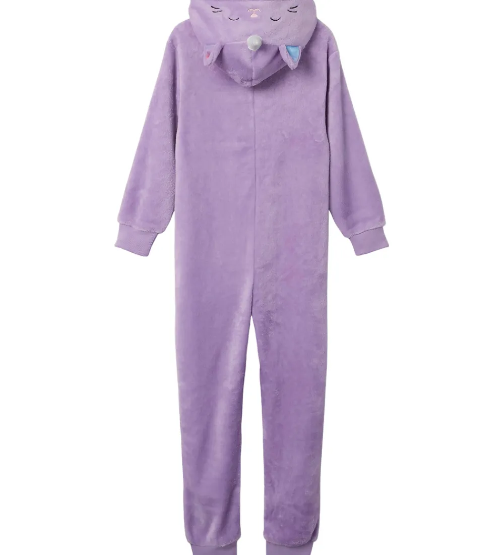 Flot Name It buksedragt i en fin lilla plys med en brodering af caticorn Squishmallowen Cienna på venstre bryst. Hætten er pyntet med søde ører og horn og fortil prydes den af et farverigt regnbuemønster på maven i en cirkel.