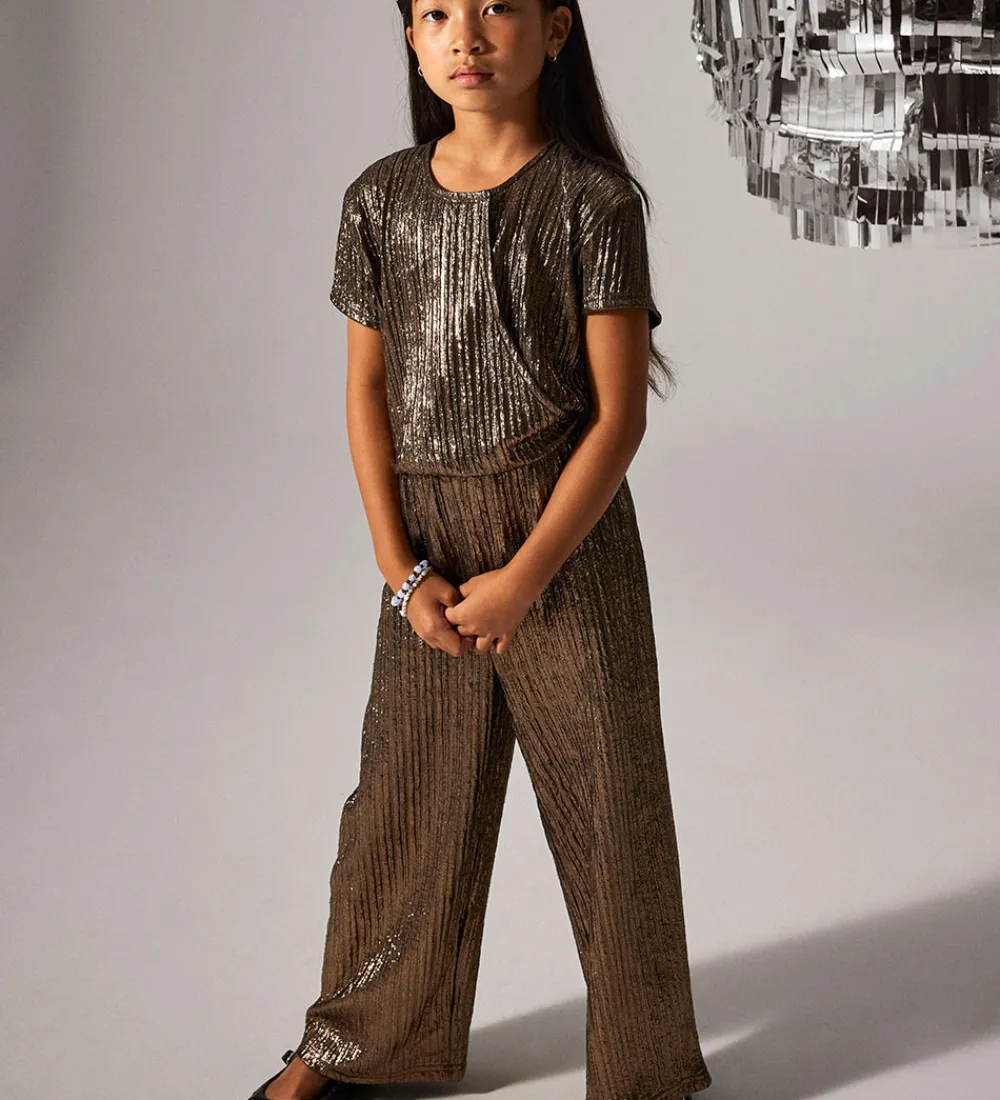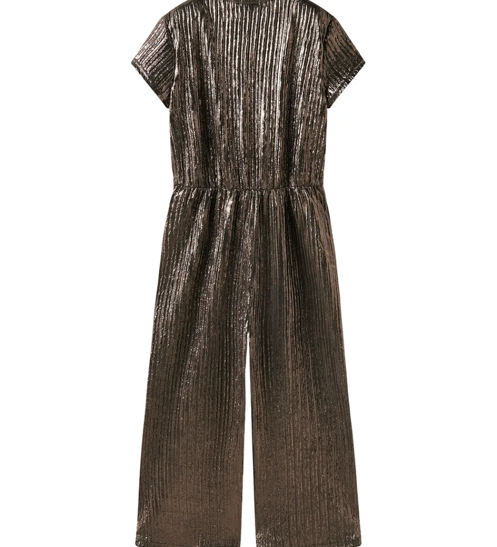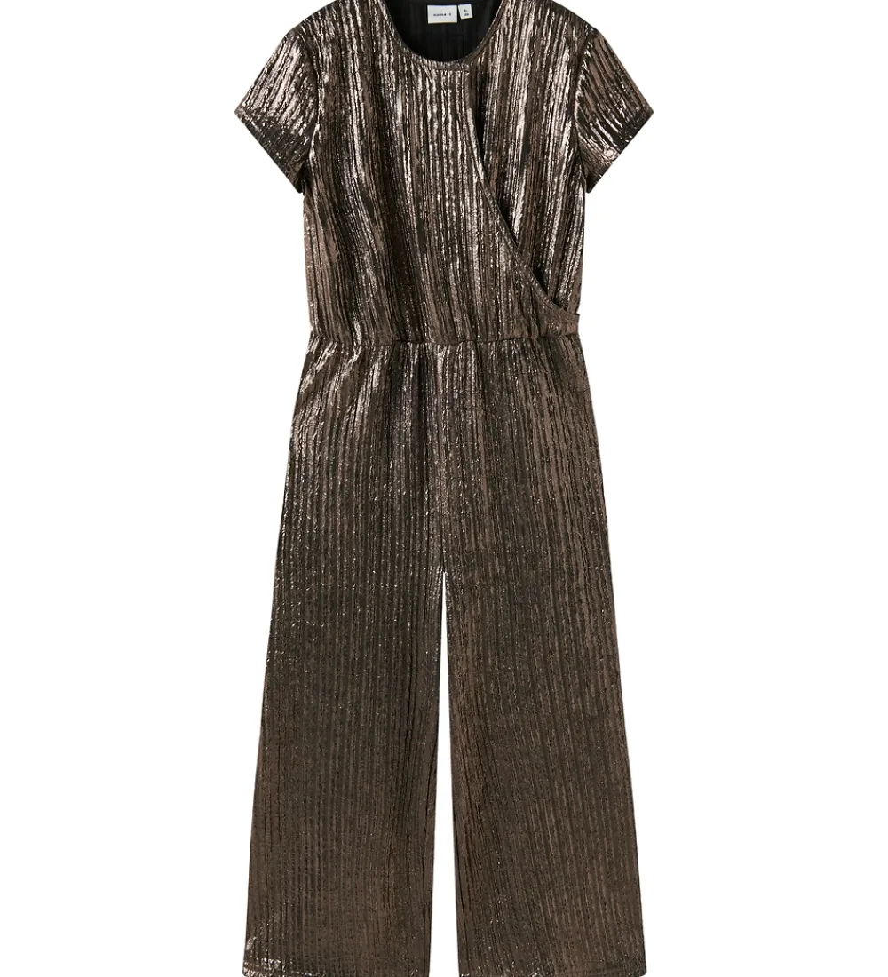 Elegant Name It buksedragt i skinnende bronzefarve med flot struktur. Name It buksedragten har korte ærmer og en rund halsudskæring med smart slå-om design med skjulte knapper i toppen. Der er en praktisk elastik i taljen, der sikrer en behagelig pasform. Benene er lange og løstsiddende, hvilket giver et stilfuldt udseende. Buksedragten har et enkelt, men raffineret design, der gør den til et moderne valg.