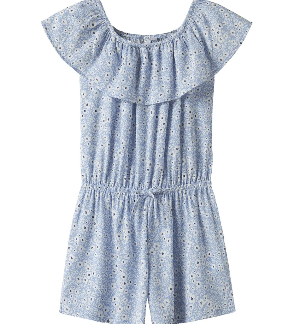 Flot Name It buksedragt i lyseblå med et smukt blomstermønster i hvid. Name It dragten har korte ærmer og en behagelig elastik i taljen, der sikrer en god pasform til hele dagen.