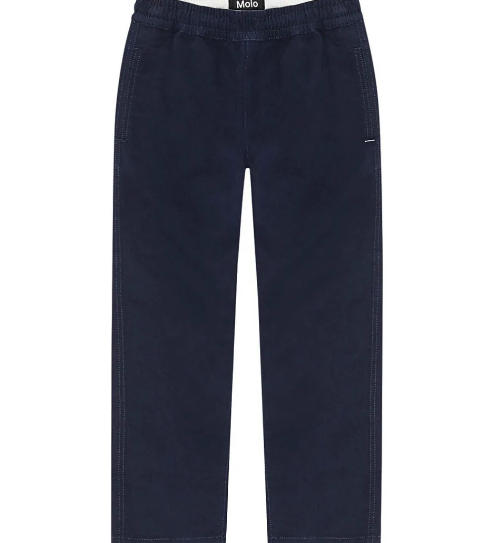 Attraktive bukser fra Molo i en dyb marineblå farve. Molo bukserne har en elastisk talje, som justeres med snore, for en behagelig pasform. Designet fremstår enkelt med lige bukseben. Bukserne har praktiske sidelommer, mens nederste kant er afsluttet uden rib, hvilket giver et rent look. Farven og pasformen gør dem til et alsidigt valg.