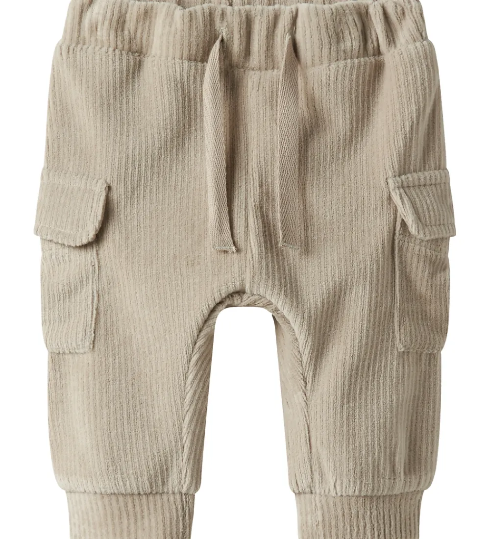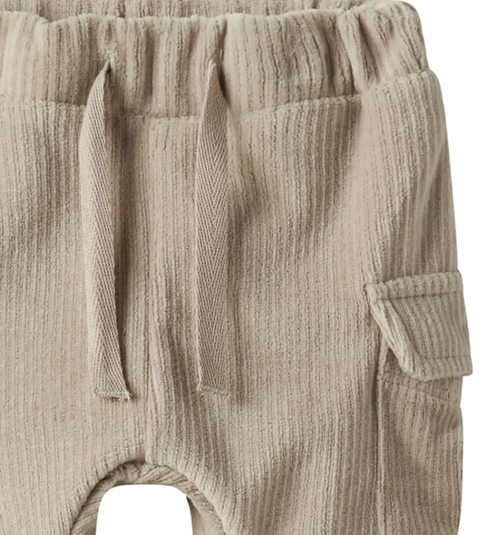 Flotte bukser fra Name It i beige fløjlsvelour. Name It bukserne har en elastisk talje, som kan justeres med knapper indvendigt. Fortil er der dekorative snører og på siderne er der store klaplommer. Benene afsluttes med ribkanter, som giver en god pasform.