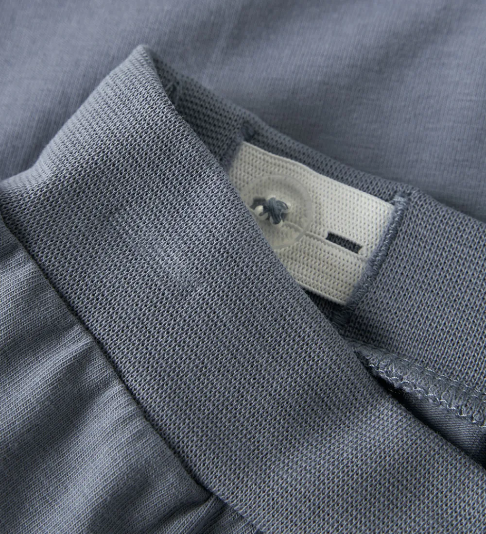 Fine bukser fra Name It i en flot blå farve med et dekorativt togprint nederst på benet. Name It bukserne har en elastisk talje, som kan justeres med knapper indvendigt. Fortil er der dekorative snører. Buksebenene afsluttes med ribkanter, der giver en god pasform.