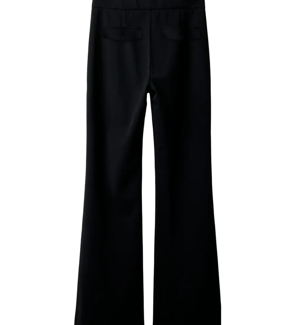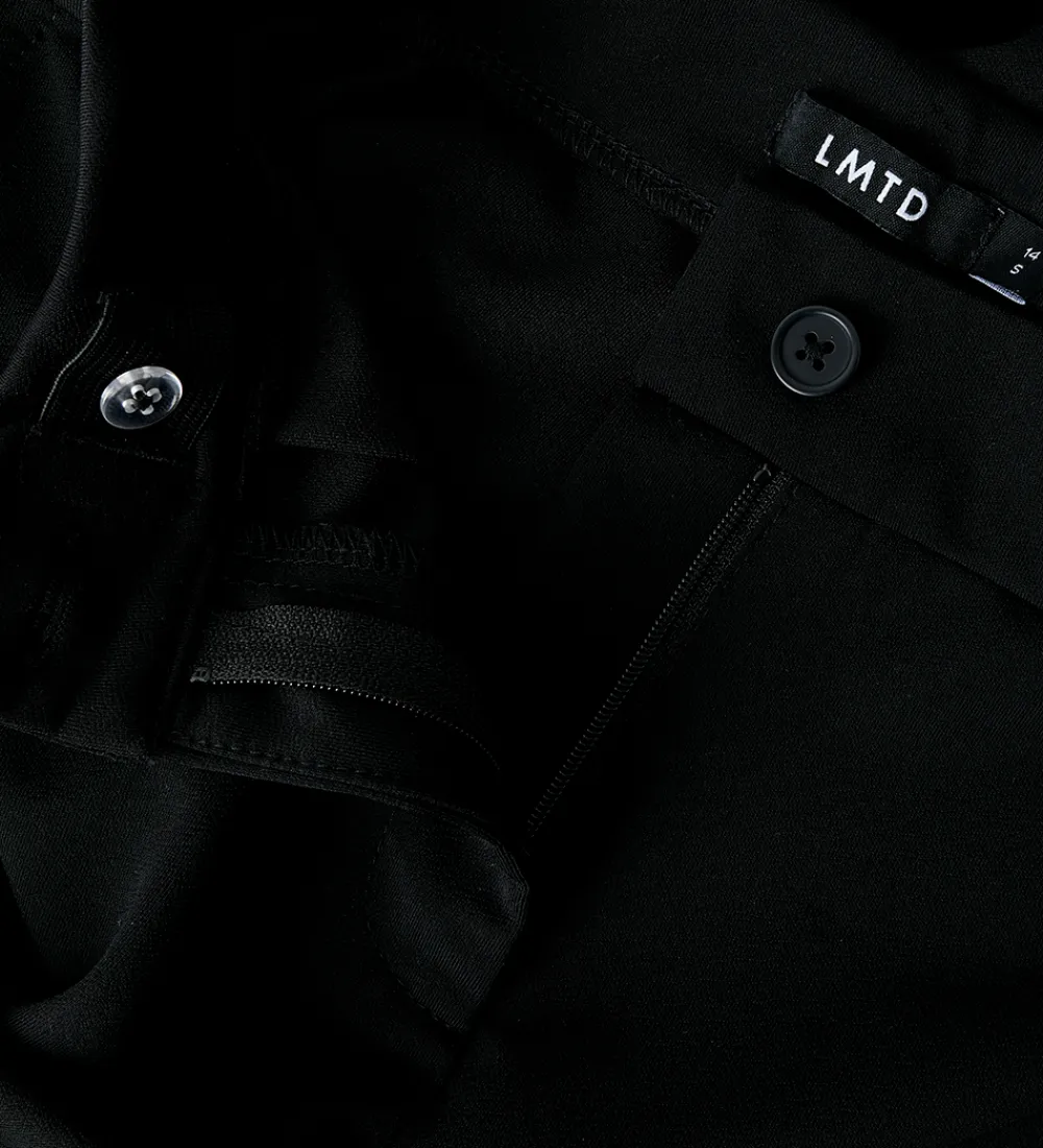Stilfulde bukser fra LMTD i sort. LMTD bukserne har et enkelt design med en tætsiddende pasform omkring lårene og vidde ved anklerne. Bukserne har elastisk talje, som kan justeres med knapper indvendigt. De lukkes foran med en knap og lynlås. Fortil er der to lommer, og bagpå er der to snydelommer.