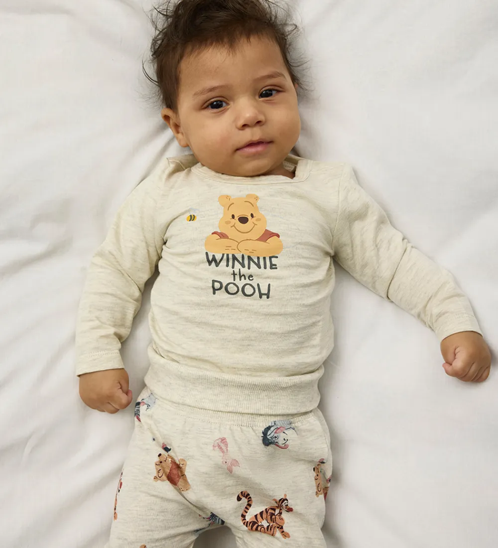 Charmerende bukser fra Name It i lys gråmeleret med et alloveprint af figurer fra Peter Plys. Name It bukserne er designet med en bred elastisk talje og afsluttes med ribkanter, som sikrer en behagelig pasform.