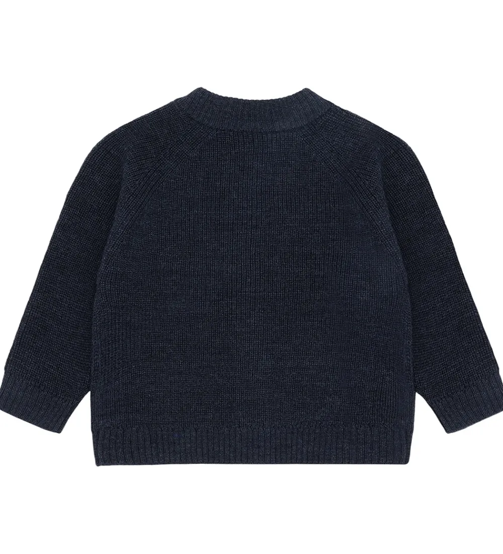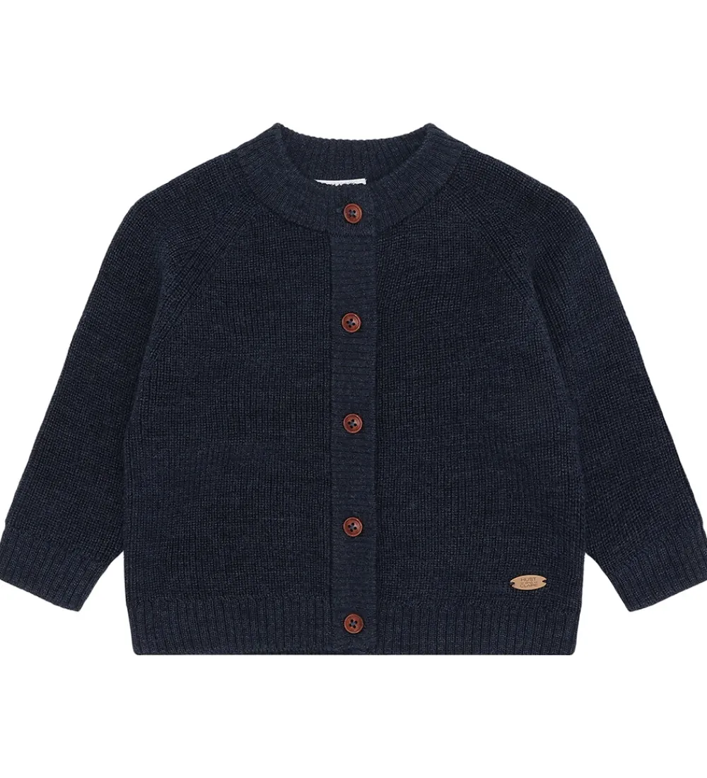 Klassisk Hust and Claire cardigan i navyblå strik. Cardiganen har en rund halsudskæring og gennemgående, brune knapper fortil. Den har lange ærmer og ribkanter i alle åbninger. Blusen er fremstillet af 100% merinould.