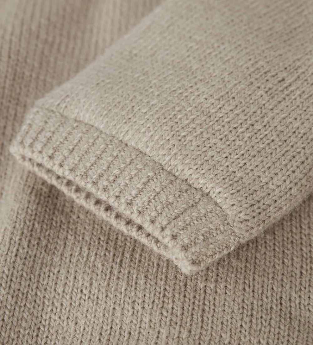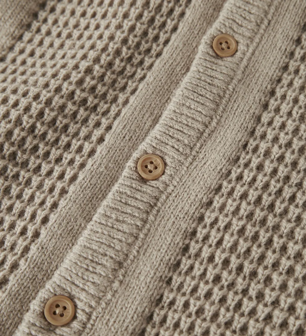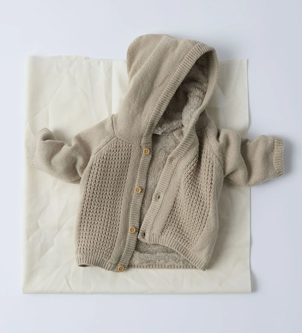 Varm cardigan fra Name It i beige. Name It cardiganen har strukturstrik foran og lukkes med gennemgående knapper. Den har en blød hætte og lange ærmer. Cardiganen har ribkanter langs alle åbninger, og indvendigt er der blødt plys.