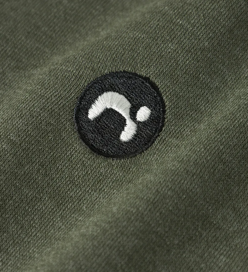 Stilren Name It cardigan i en afdæmpet, grøn nuance med lange ærmer og praktisk hætte.