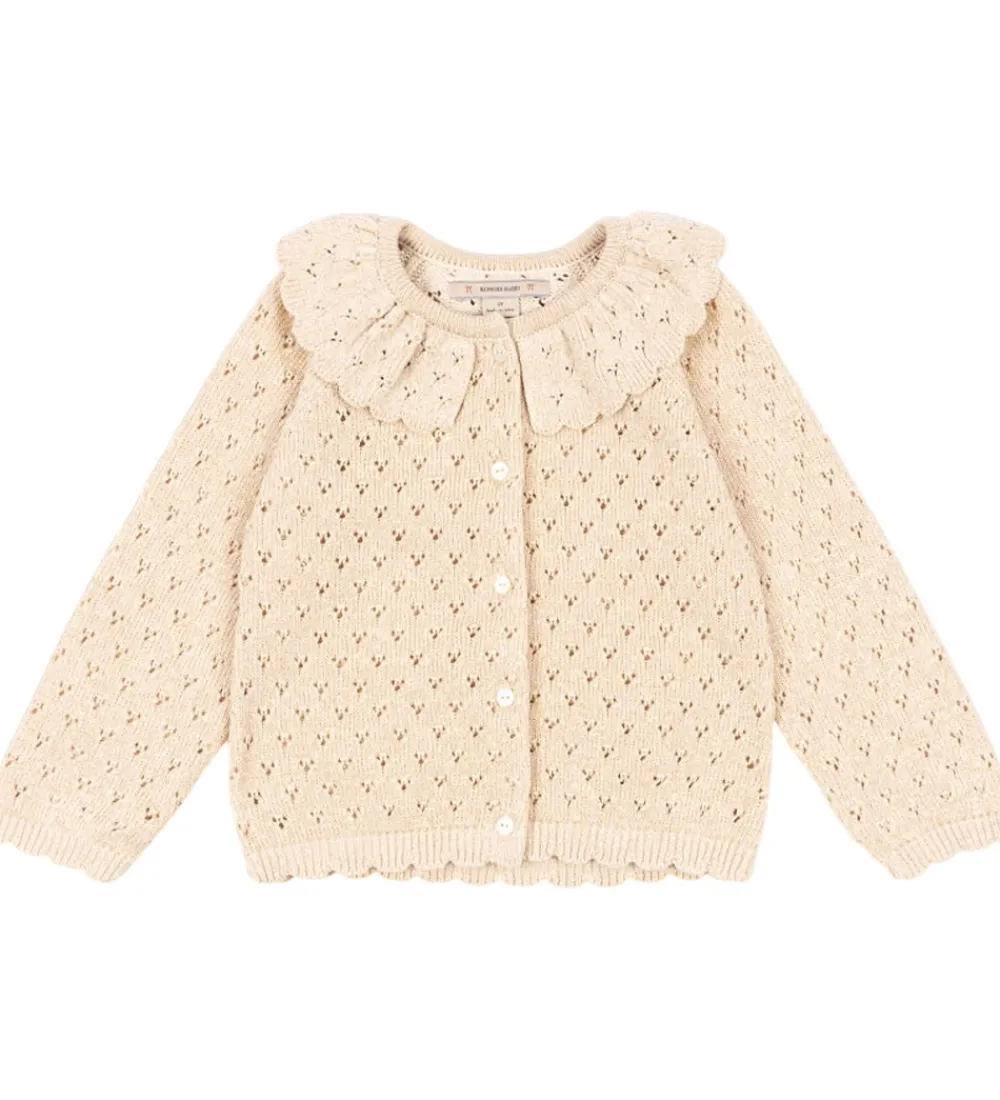 Yndig Konges Sløjd cardigan i en blød, beige nuance med glimmer og et fint hulmønster og, der giver et elegant udtryk.