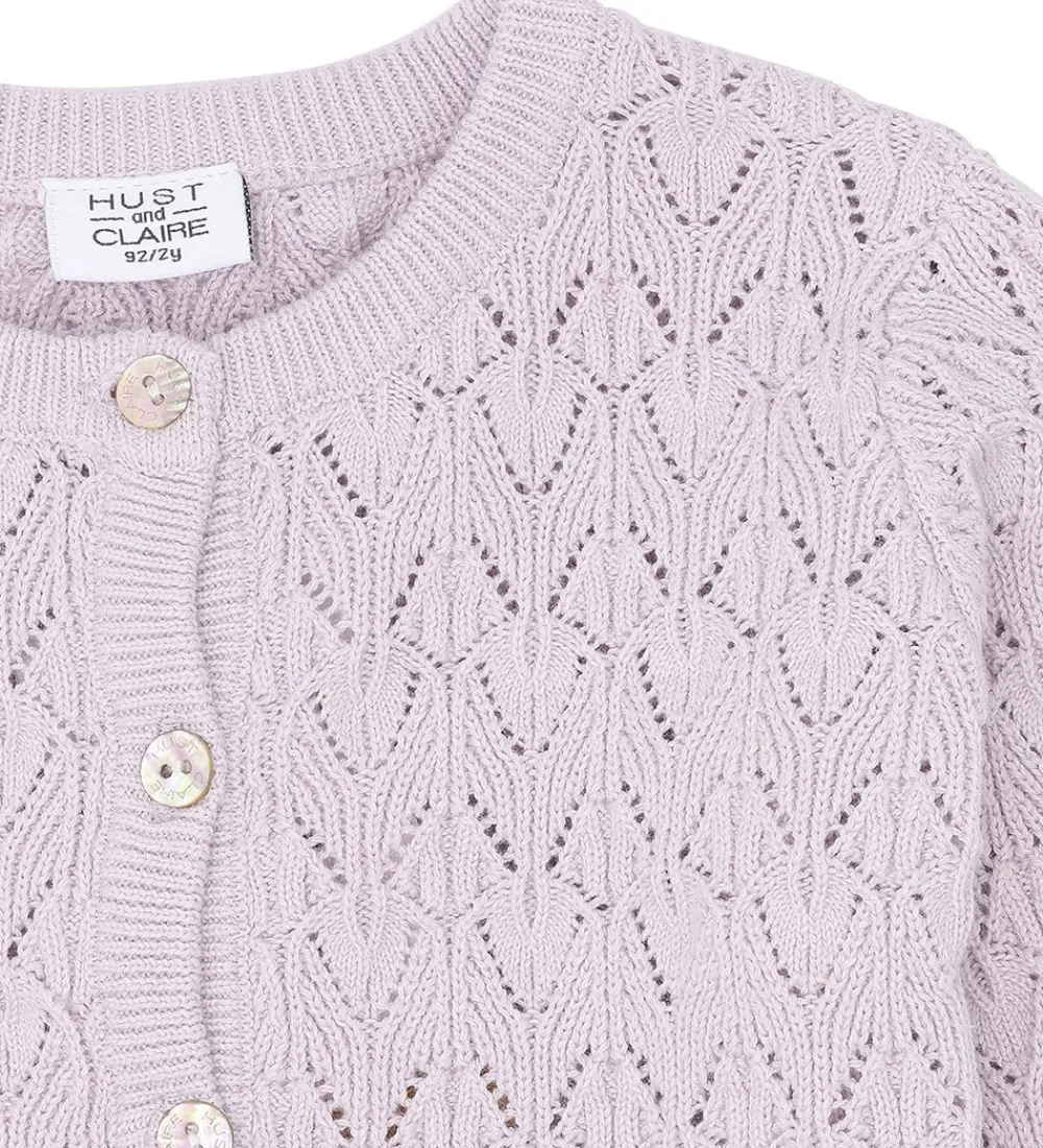 Smuk Hust and Claire cardigan i en lys lilla nuance, med et fint strikket hulmønster. Cardiganen tilføjer et let og elegant touch til enhver påklædning.