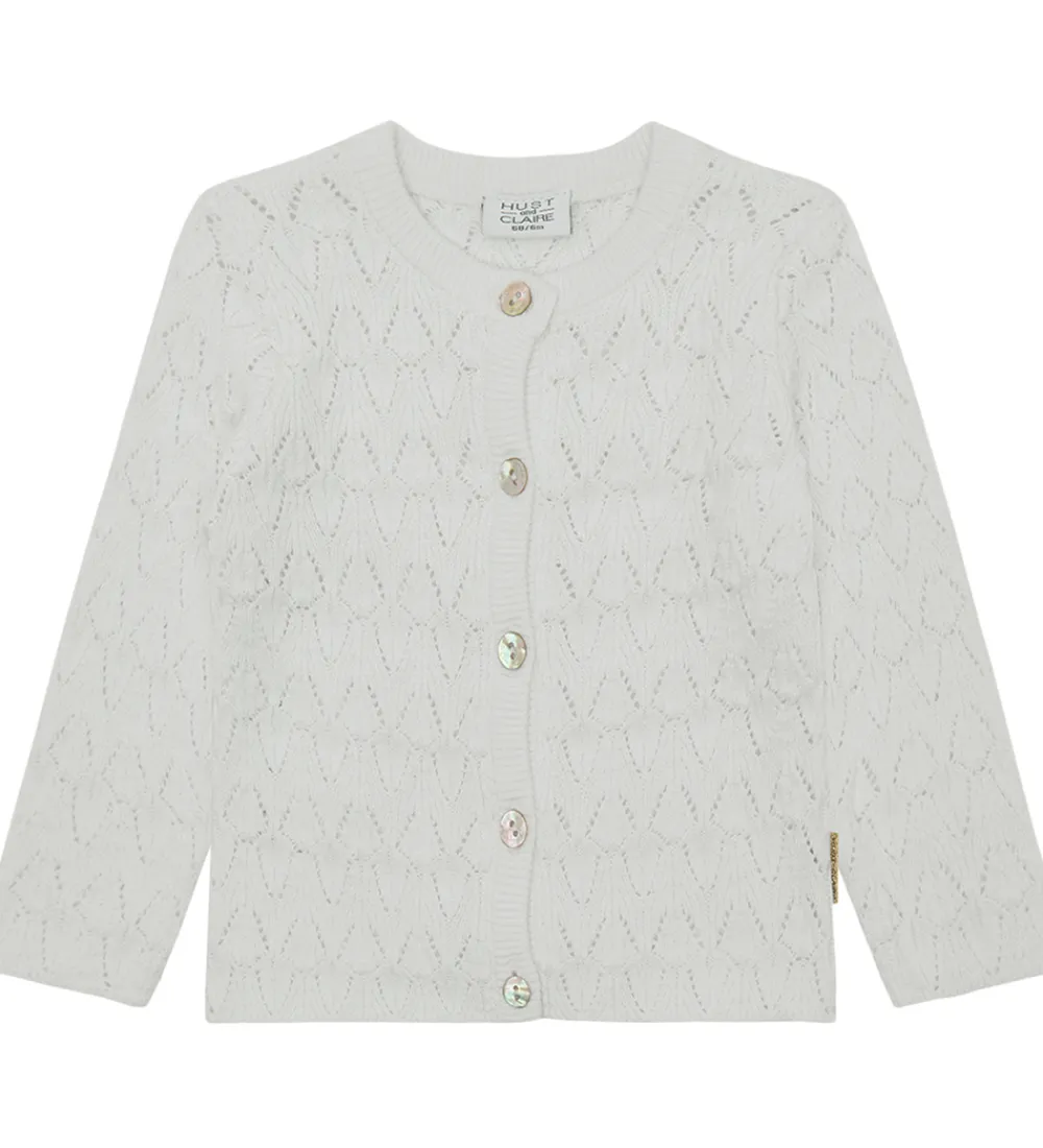 Lækker Hust and Claire cardigan i hvid strik med et flot allover hulmønster samt gennemgående lukning med perlemorsknapper fortil.