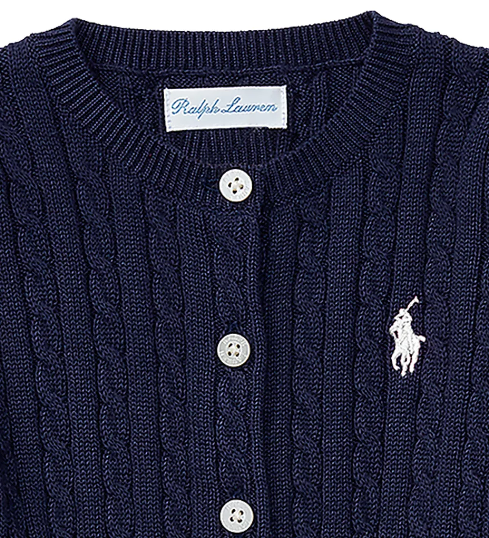 Flot Polo Ralph Lauren cardigan i navy i en strikket bomuldskvalitet med et flot, snoet mønster. Fortil i venstre side er der broderet et lille, hvidt logo.