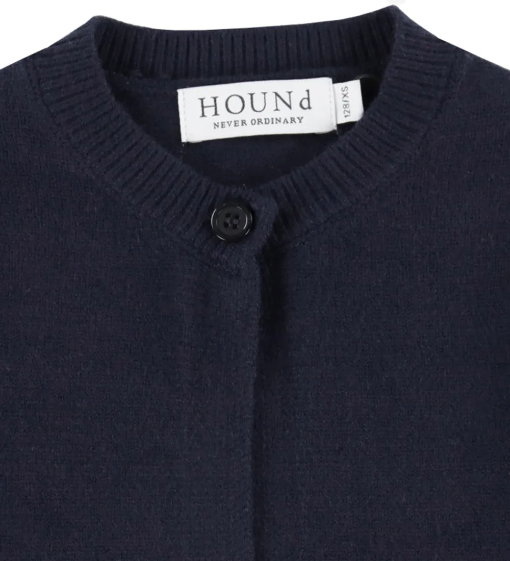 Stilren Hound cardigan i en dyb navy strik. Cardiganen har ribkanter ved alle åbningerne, der tilføjer en klassisk detalje.