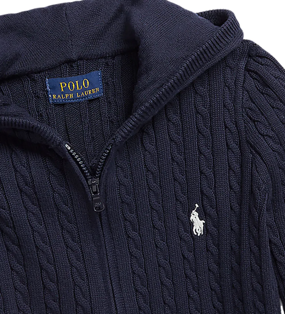 Flot Polo Ralph Lauren cardigan i navy bomuldsstrik med et snoet mønster. I venstre side er der broderet et lille, hvidt logo.
