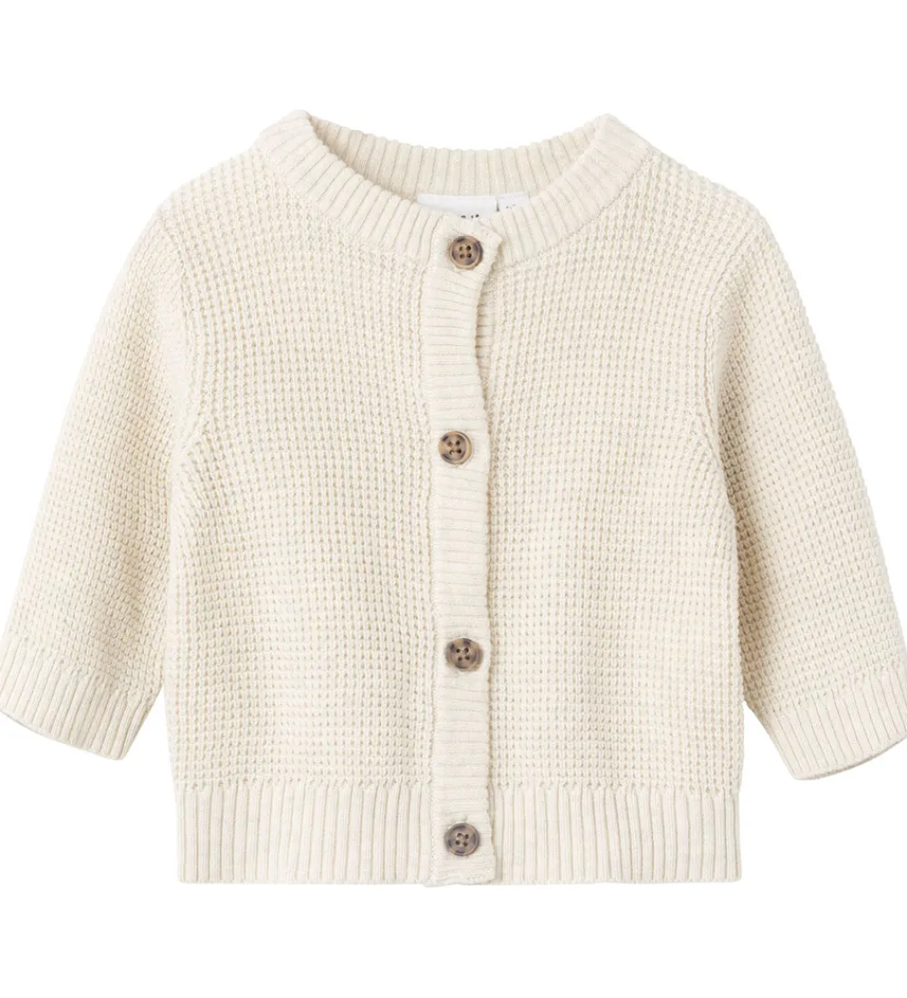 Lækker Name It cardigan i meleret beige og i en flot vaflet mønsterstrik.