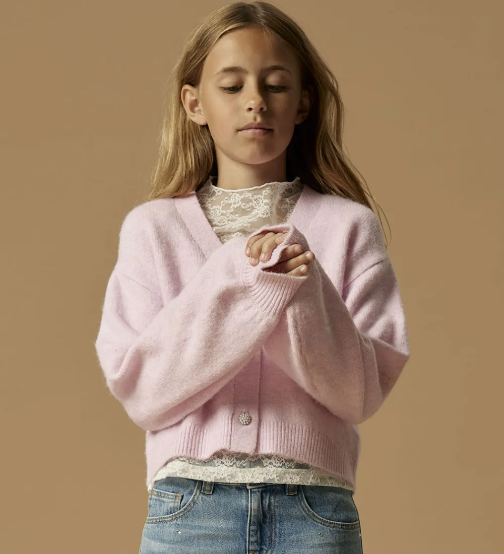 Flot Name It cardigan i en lys, rosa farve med lange ærmer.