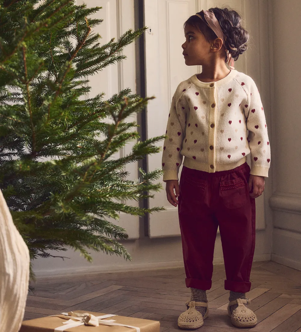 Charmerende Lil Atelier cardigan i råhvid strik og med et allover hjerteprint i rosa og brun. Lil Atelier cardiganen lukkes med dekorative knapper fortil og har behagelige ribstrikkede kanter.