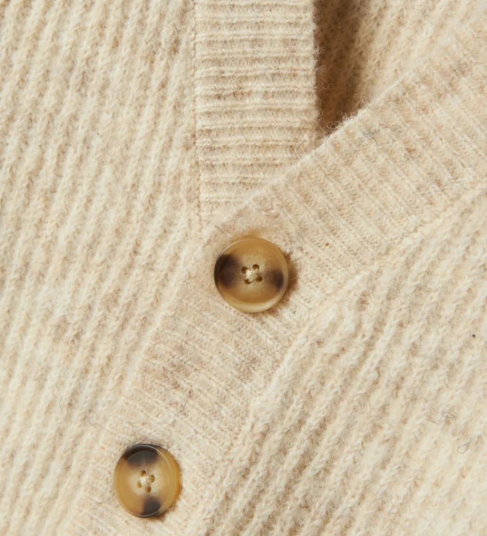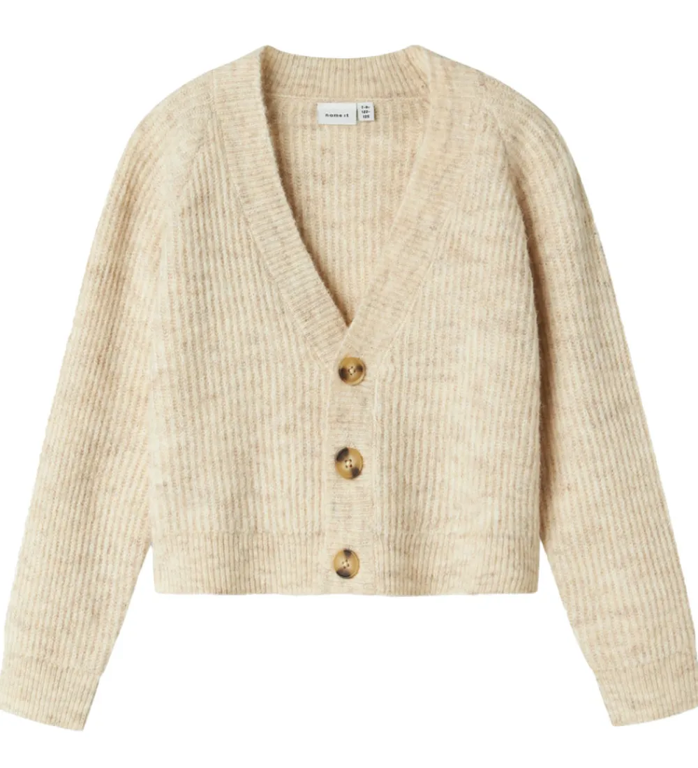 Skøn Name It cardigan i meleret, beige strik og med en flot ribstruktur.